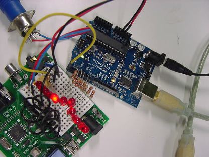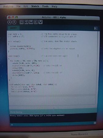 /* Midi In Basic 0.2 // kuki 8.2007 * * ----------------- * listen for midi serial data, and light leds for individual notes IMPORTANT: your arduino might not start if it receives data directly after a reset, because the bootloader thinks you want to uplad a new progam. you might need to unplug the midi-hardware until the board is running your program. that is when that statusLed turns on. ################################################ SOMETHING ABOUT MIDI MESSAGES midi messages start with one status byte followed by 1 _or_ 2 data bytes, depending on the command example midi message: 144-36-100 the status byte "144" tells us what to do. "144" means "note on". in this case the second bytes tells us which note to play (36=middle C) the third byte is the velocity for that note (that is how powerful the note was struck= 100) example midi message: 128-36 this message is a "note off" message (status byte = 128). it is followed by the note (data byte = 36) since "note off" messages don't need a velocity value (it's just OFF) there will be no third byte in this case NOTE: some midi keyboards will never send a "note off" message, but rather a "note on with zero velocity" do a web search for midi messages to learn more about aftertouch, poly-pressure, midi time code, midi clock and more interesting things. ################################################ HARDWARE NOTE: The Midi Socket is connected to arduino RX through an opto-isolator to invert the midi signal and seperate the circuits of individual instruments. connect 8 leds to pin2-pin9 on your arduino. ################################################ */ //variables setup byte incomingByte; byte note; byte velocity; int statusLed = 13; // select the pin for the LED int action=2; //0 =note off ; 1=note on ; 2= nada //setup: declaring iputs and outputs and begin serial void setup() { pinMode(statusLed,OUTPUT); // declare the LED's pin as output pinMode(2,OUTPUT); pinMode(3,OUTPUT); pinMode(4,OUTPUT); pinMode(5,OUTPUT); pinMode(6,OUTPUT); pinMode(7,OUTPUT); pinMode(8,OUTPUT); pinMode(9,OUTPUT); //start serial with midi baudrate 31250 or 38400 for debugging Serial.begin(31250); digitalWrite(statusLed,HIGH); } //loop: wait for serial data, and interpret the message void loop () { if (Serial.available() > 0) { // read the incoming byte: incomingByte = Serial.read(); // wait for as status-byte, channel 1, note on or off if (incomingByte== 144){ // note on message starting starting action=1; }else if (incomingByte== 128){ // note off message starting action=0; }else if (incomingByte== 208){ // aftertouch message starting //not implemented yet }else if (incomingByte== 160){ // polypressure message starting //not implemented yet }else if ( (action==0)&&(note==0) ){ // if we received a "note off", we wait for which note (databyte) note=incomingByte; playNote(note, 0); note=0; velocity=0; action=2; }else if ( (action==1)&&(note==0) ){ // if we received a "note on", we wait for the note (databyte) note=incomingByte; }else if ( (action==1)&&(note!=0) ){ // ...and then the velocity velocity=incomingByte; playNote(note, velocity); note=0; velocity=0; action=0; }else{ //nada } } } void blink(){ digitalWrite(statusLed, HIGH); delay(100); digitalWrite(statusLed, LOW); delay(100); } void playNote(byte note, byte velocity){ int value=LOW; if (velocity >10){ value=HIGH; }else{ value=LOW; } //since we don't want to "play" all notes we wait for a note between 36 & 44 if(note>=36 && note<44){ byte myPin=note-34; // to get a pinnumber between 2 and 9 digitalWrite(myPin, value); } }これを走らせてみると、注意書きにあった「起動してLEDが点灯した後にMIDIからのシリアル入力に差し換える」 という方法により、Max/MSPからのMIDIを受信してLEDが点滅した。 ただし、「受け落とし」がとても頻繁に起きた。 これは経験的に言えば「使えない」レベルである。 シリアルポートへのMIDI入力に対して、おそらく割り込みによるバッファリングを行っていないからだろうか。 このような受け損ねがあっては、まず使えたものではない、と確認できた。 写真にあるように、makenoteによってON-0FFを1000msecのdurationで送っているのもかかわらず、 OFFで消える筈のLEDが累々と点灯したままであった。