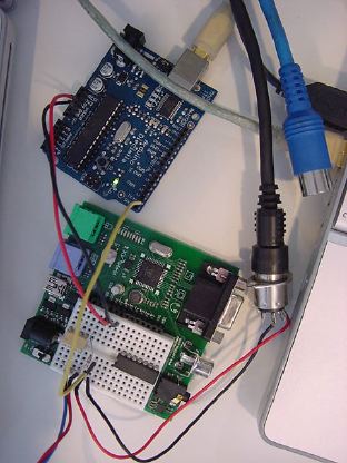 int old_data = 0; int new_data = 0; byte incomingByte; byte status; byte note; byte velocity; int ledPin = 13; // LED connected to digital pin 13 void setup() // run once, when the sketch starts { Serial.begin(31250); pinMode(ledPin, OUTPUT); // sets the digital pin as output } void loop() // run over and over again { if (Serial.available() > 0) { incomingByte = Serial.read(); // Serial.print(incomingByte, BYTE); digitalWrite(ledPin, HIGH); // sets the LED on delay(500); // waits for a second digitalWrite(ledPin, LOW); // sets the LED off } /* new_data = analogRead(0) / 8; if ( new_data != old_data ) { midiOut(0xb0, 0, new_data); old_data = new_data; } */ } void midiOut(char cmd, char data1, char data2) { Serial.print(cmd, BYTE); Serial.print(data1, BYTE); Serial.print(data2, BYTE); }やっぱり、MIDI送信との共存の以前に、まずMIDI受信で手こずりそうである。 ここで時間切れとなったので、また週末にでもトライしてみよう。