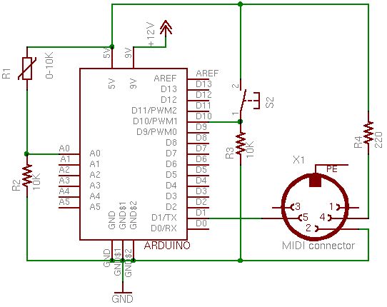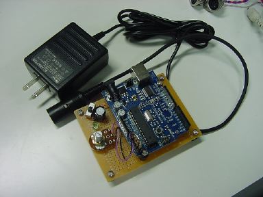 とりあえず、ソフトタイマーで周期的にMIDIが出たので、 ここ を参考にして、次には、アナログ入力に0-5Vの電圧を連続的に与えて、 MIDIコントロールチェンジで送れるかを試した。