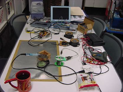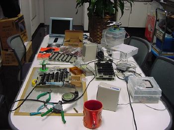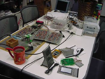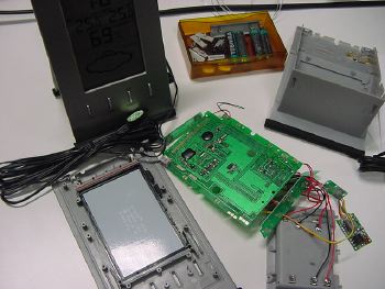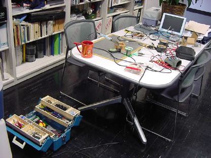 講義のない水曜日、製作日和である。 作業中のテーブルとともに、現在、抱えているプロジェクトの写真も取ってみた。これは4回生の村松さんの制作プロジェクトに関してバラして調べた「お天気センサ」。