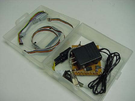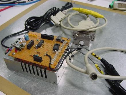 次には、このところ懸案だった、AKI-H8の書き込み機の小型軽量化を目指した。 以下が、これまでの書き込み機である。 スイッチング電源の上に載せていたが、Sketch03に持参するとなれば、 もっと軽くしたい。 だいいち、最初はDSUBの25ピンでWindows95に繋いでいたのが、 次にVirtualPC(Windows98)でMacのシリアル(8ピン丸型)に繋いで、 その後はWindowsXPで9ピンのDSUBへ、とコネクタ付近がパラに鈴なりになっている。 これを何とかしたい。