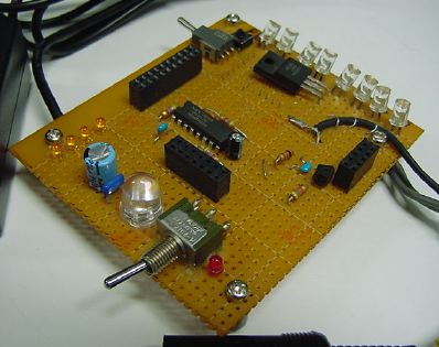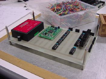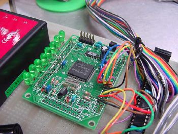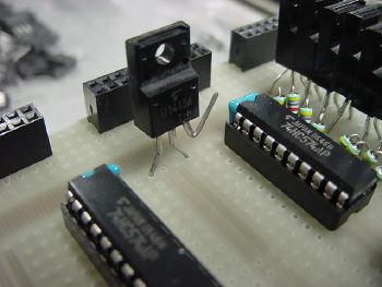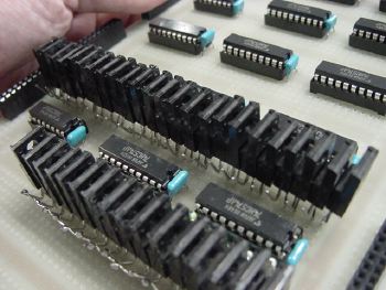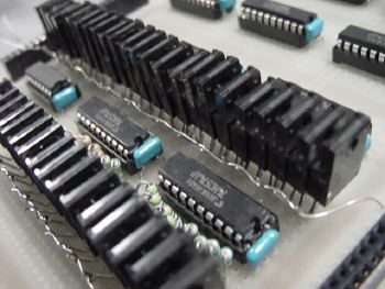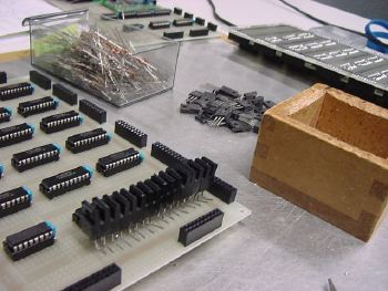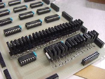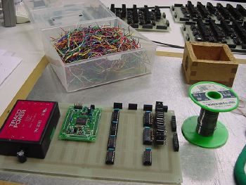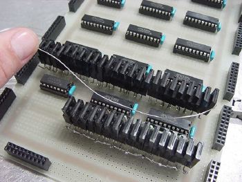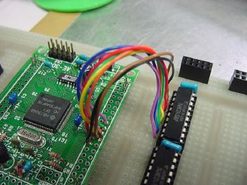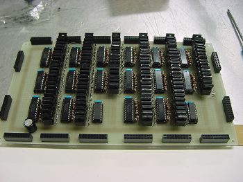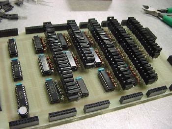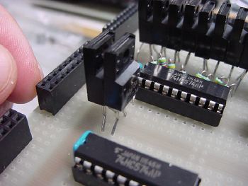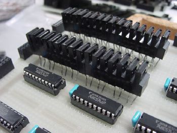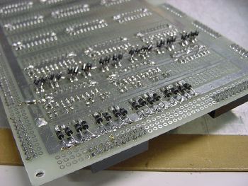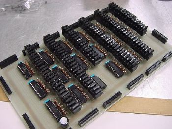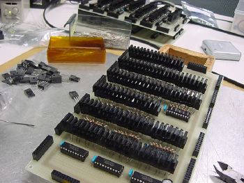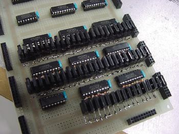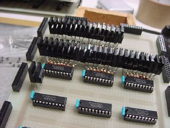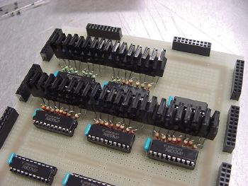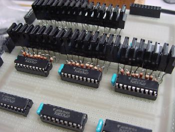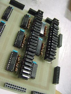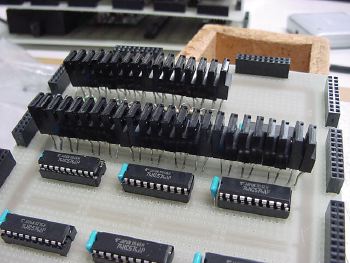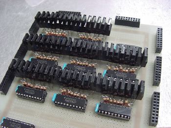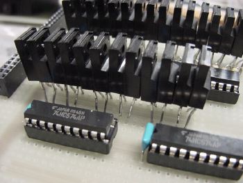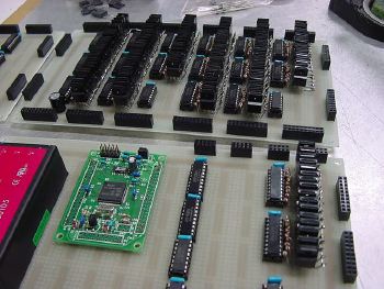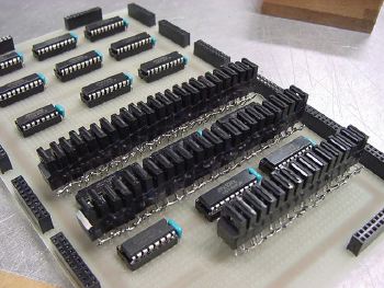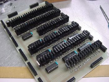 とりあえずまず1枚、ソケットのピンと電源回り(パスコン)をハンダ付けして、 ICを挿してみると、まだまだ配線はこれからなのに、ちょっといいカンジ。(^_^)