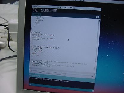 午前に大学院の講義、午後に委員会が3つあって時間が取れなかったが、合間に昨日のプログラムをちょっとだけ改造した。 以下は、6チャンネルのA/D入力をMIDI出力するという、もっとも定番のMIDIセンサである。 データは敢えて解像度を半分にして、チャタリングを抑止している。 このデータをFLASHメモリに焼いたArduinoボードは、そのまま汎用のMIDIセンサとして使うことにしよう。 プログラムは以下である。int new_data[6] = {0,0,0,0,0,0}; int old_data[6] = {0,0,0,0,0,0}; void setup() // run once, when the sketch starts { Serial.begin(31250); } void loop() // run over and over again { for(int i=0;i<6;i++){ new_data[i] = analogRead(i) / 16; if ( new_data[i] != old_data[i] ) { midiOut(0xb0, i, new_data[i]*2); old_data[i] = new_data[i]; } } } void midiOut(char cmd, char data1, char data2) { Serial.print(cmd, BYTE); Serial.print(data1, BYTE); Serial.print(data2, BYTE); }2008年6月6日(金)
