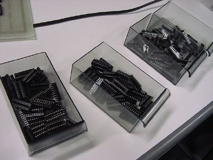 さて、ここで作業テーブルの上を整理しなおして、新しい製作に取りかかることにした。 M2の鈴木絢の修了制作の一端となる、あるインスタレーションのインターフェースの製作が宿題であった。 これは完成すれば、おそらくセンセーショナルな作品となる予感がある。 とりあえずザッと見積ってみたが、74HC574が50個、74HC245が2個、74HC138が8個ほど必要である、 と判明した。