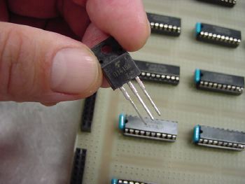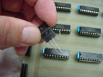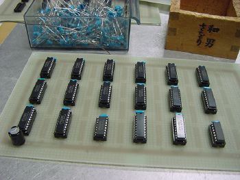 これだけ並んでいるとスッキリしているが、このICの間に、ICあたり8個ずつのパワートランジスタが割り込み、 空中配線となる。 さらに基板の裏側には、いつものジヤングル配線が待っている、と思うと、ちょっと立ちすくむ。 明日は講義が2つあるので、今日はここまでとしよう。