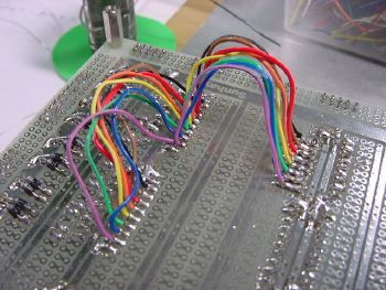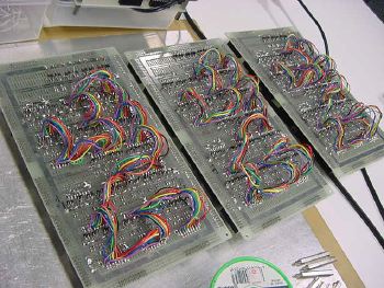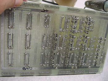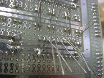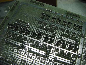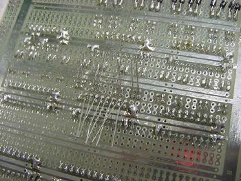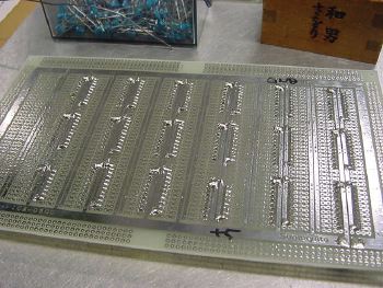 これはまだまだ、「配線」以前の下準備であるが、ここをキチッとやらないと、回路は動いてくれない。 午前中にはいろいろ雑事もあったものの、基板1枚分、16回路が終わったところでほぼ1日となってしまった。