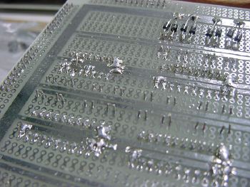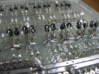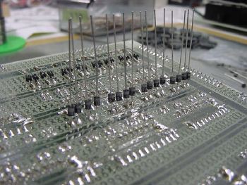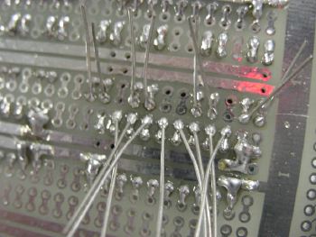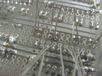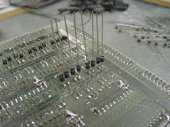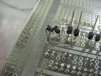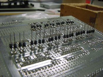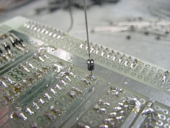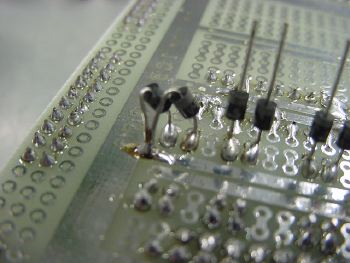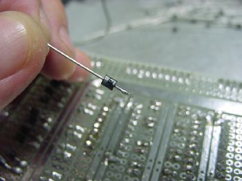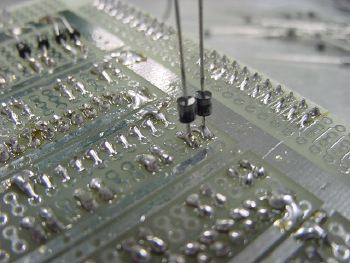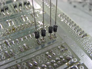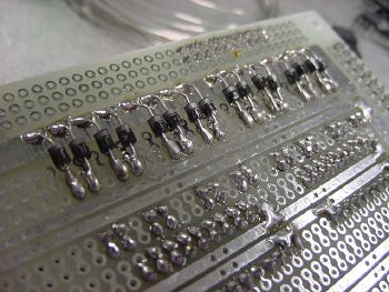 ここからはまたラジオペンチの活躍で、リードを基板の+5Vラインに接触させる。 ダイオードを2個単位で接触させるのがコツ。