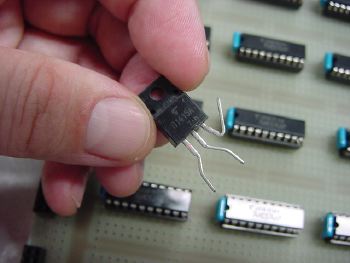 ここからが長い。 最後の3枚目の最初の1列(1ビット・モーター4回路)が終わったところで、 気分転換に、この「下準備」のハンダ付け作業を詳細に記録してみることにした。 まず、パワートランジスタの足をラジオペンチで曲げる。 ヘタに曲げると壊すので、慎重に一気に曲げる。