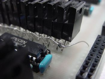 ここで基板を再び裏返す。トランジスタで残っているのはエミッタのリード。