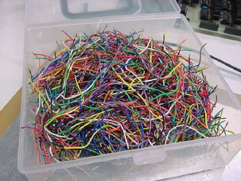 上の写真が下の写真になるのに30分。 いよいよ、鈴木絢マシンの製作がスタートした。 ここで、「この手の作品では学生に製作の下請け(配線用線材の量産作業)をしてもらいますので 近日中に1106に来るアポを入れて下さい」と絢にメイル。 これまでも、回路の配線に手を出せない学生たちは、 配線のためのカラーケーブルの線材(両端をハンダメッキ)とか、LEDに延ばす配線などについては、 たくさん量産して、少しは手伝った、という手応えを体験させてきた。 ここ とか ここ とか ここ とか ここ とか ここ とか ここ とか ここ とか ここ とか ここ とかに、その片鱗があるが、眺めてみると、いやー、懐かしい(^_^)。