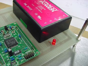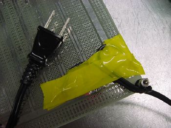 AC-DCコンバータに電源ラインを接続。 感電防止のためにきっちりとテープで絶縁。