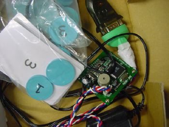 これは4回生の秋津さんと松永さんのそれぞれの制作プロジェクトのインスタレーション作品で使う予定の、 RFIDのレシーバ。 現在のところMax/MSPでシリアルから受けているが、作品をFLASHで作る関係で、 このRFID情報をGAINERに渡すマシンをそれぞれに作る必要がある。 たぶんAKI-H8で作る予定。