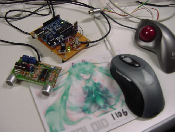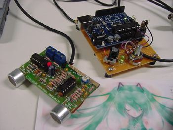 10時間カラオケ、10時間睡眠など激動の週末を経て、 とりあえず梅雨前線活発化の大雨の中、作業を続けるべく研究室へ。この日はまず、任田さんと小畑さんにグラフィクスの開発を頼んでいるインスタに関連して、 超音波センサからおよその距離データをArduinoボードの2ポート目に取り出して、 ボリュームに続いてパラメータとして使えるようにしてみた。