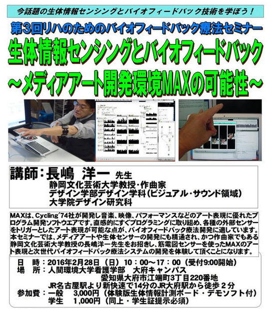 - 「赤外線距離センサ」+「画像認識センサ」を使って約2分間のMaxデモ演奏 (これもバイオフィードバック)