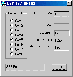 Connecting the SRF02 to your PC via USB is this easy. The USBI2C module supplies the SRF02 with power directly from the USB bus. The USB_I2C_SRF02 program can be downloaded here.
