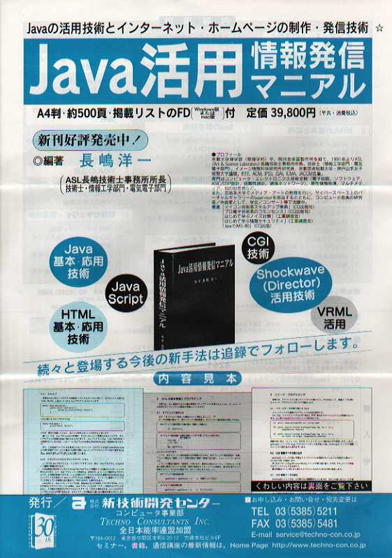 - 新たに登場した"Java"に注目し、Java.sun.comで全公開されている情報からJavaを独学し、CQ出版から「Java & AKI-80」を刊行★。最初の「日本語によるJava本」のうちの1冊となり、書泉グランデで平積みになったとCQ編集長も喜んだ。「Javaバイトコードを元のJavaソースに戻す」という「Java逆コンパイラ」(rejeva.exe)をC言語で開発して掲載し、「OS/2研究会」など多くの人々から利用許諾を求められて[→全てOK]、その後は ★ 数多くの「Javaセミナー」の講師を依頼された