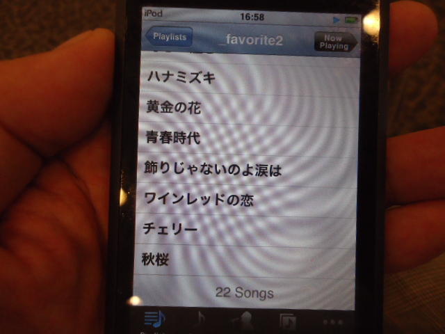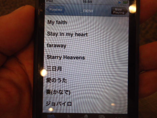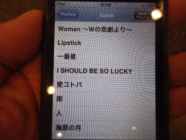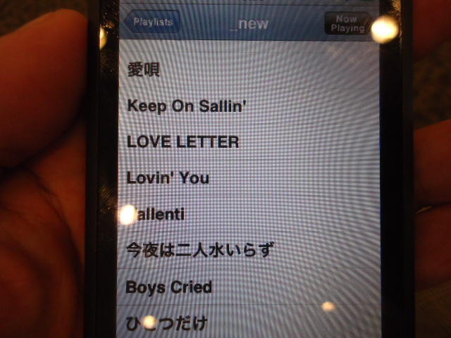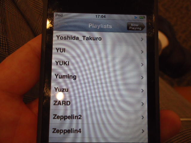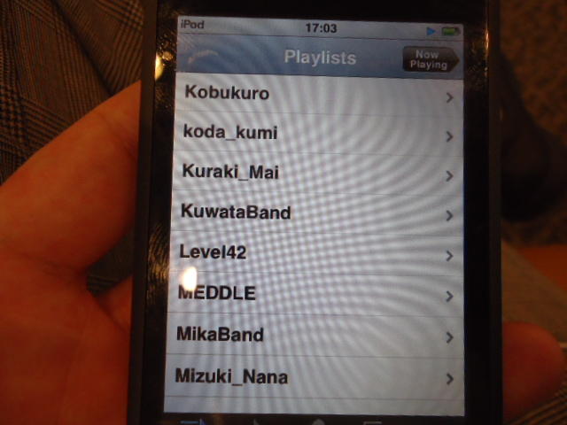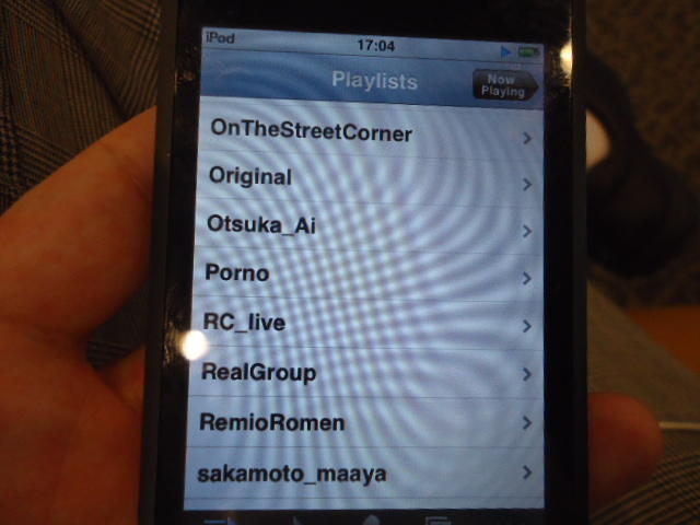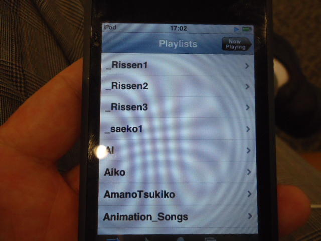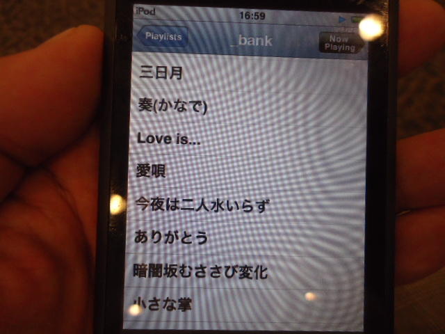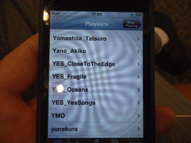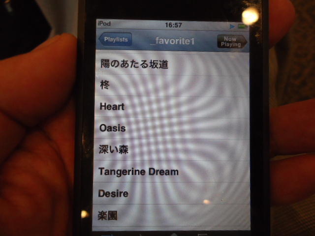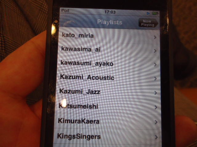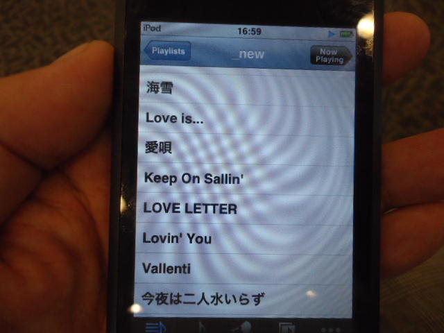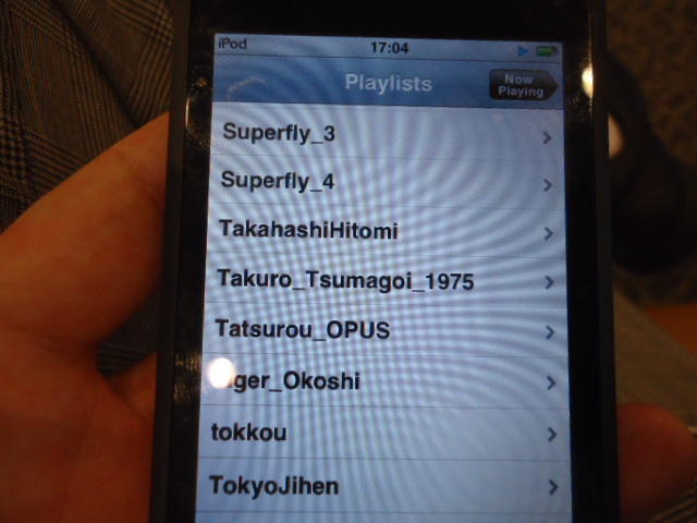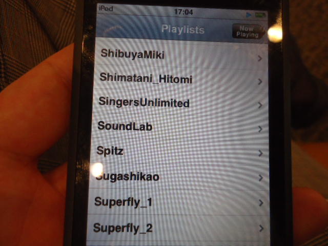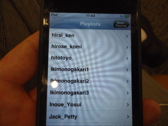 ところがその学会論文を見たパイオニアから突然にメイルが届いて、「車酔いを低減させるためにカーステレオ(パイオニアが得意な製品)の音像移動が使えないか」という受託研究に発展して、研究費をいただいて実験を進めたのです。学生は被験者として「計15分(7分+7分)ほどクルマに乗って、目をつぶって、特製コントローラのジョイスティックを、イアホンで聞いている音楽(「まけないで」)と身体感覚(右折/左折のG)が合っていれば(positive)上に上げ、違和感があれば(negative)下に下げ、どちらでもなければ脱力(→バネで中央に戻る)」という実験(協力者の報酬は15分で3000円!!)というのに応募して20人ぐらいやりました。被験者の鼻先にはCO2センサがあって、酔ったり眠気が出た被験者(→データを除外)が特定できました。ところが2年目の実験では、下級生が多数応募してきたものの、1回やった学生の応募はゼロでした。それだけストレスがあった模様です(^_^;)- 僕は新しい音楽でなくても積極的に聴きたいと思います。音楽メディアの形式や音質にはそれほど拘らなくてもそこにいる人の声を聞きたいという気持ちが強いです。音楽で様々な胸の内を表現したい一方、小市民的な立場を守りたい気持ちもあります → 「小市民的な立場」などと卑下することなく、新しくなくても自分が好きな良い音楽を愛好するというのは素晴らしいことだと思います。僕も偉そうにComputer Musicの話をしましたが、例えば海外出張で長時間のフライトの時に聞くために持参するiPod touchに入っている音楽というのは、こんなもんです。2013年に スケッチング2013 に行くために成田空港で、「サンフランシスコ行きに乗り込む長蛇の列を尻目に椅子で待っている合間に撮った、手元のiPodの曲メニューの一部」というのは ★ ★ ★ ★ ★ ★ ★ ★ ★ ★ ★ ★ ★ ★ ★ ★ ★ ★ ★ ★ ★ ★ ★ ★ ★ ★ ★ ★ ★ ★ ★ ★ ★ ★ ★ というようなもので、詳細は省略しますが、JPOPについては僕の マイリスト と数多く重複しています