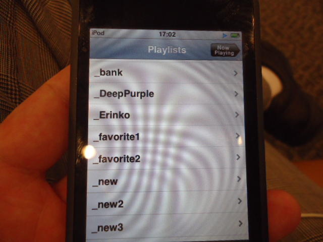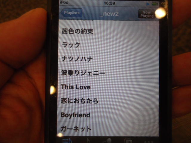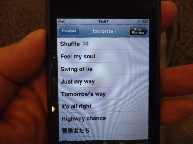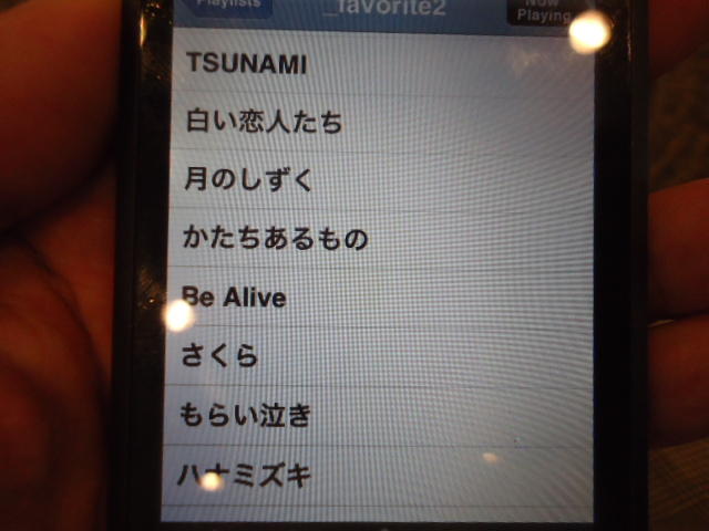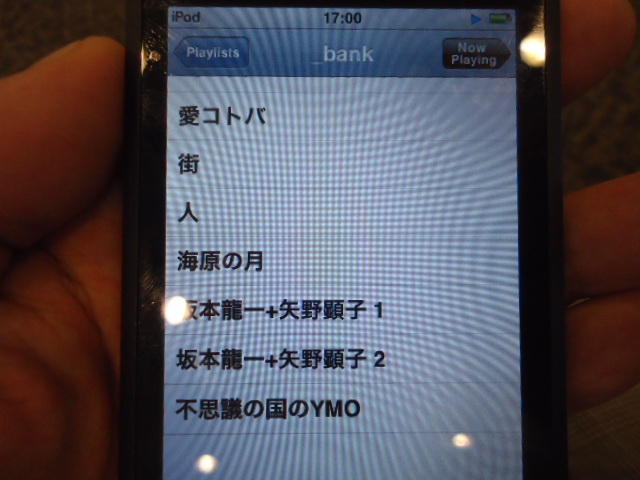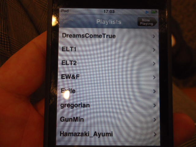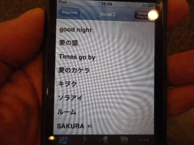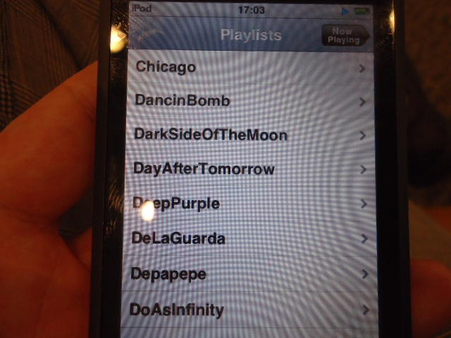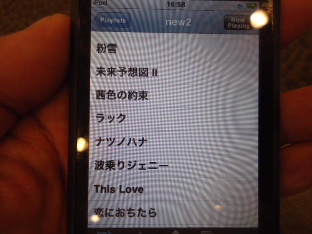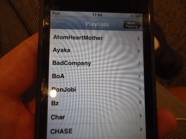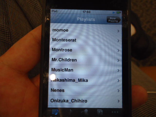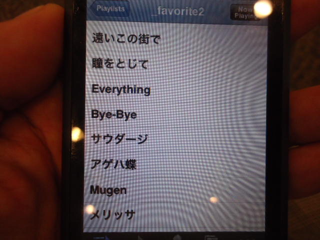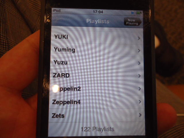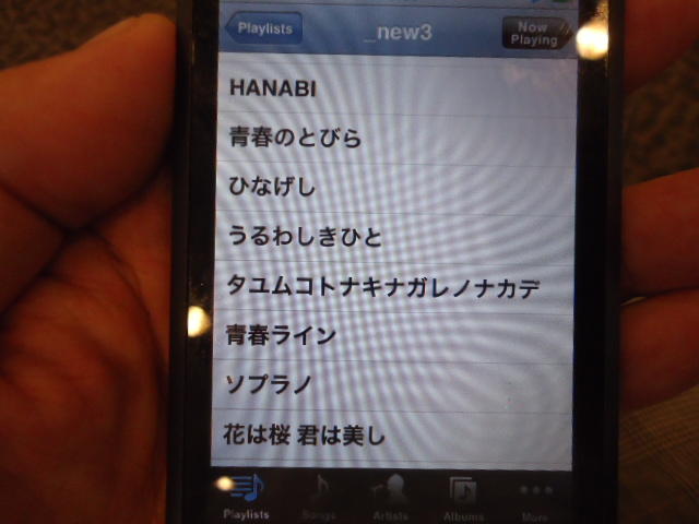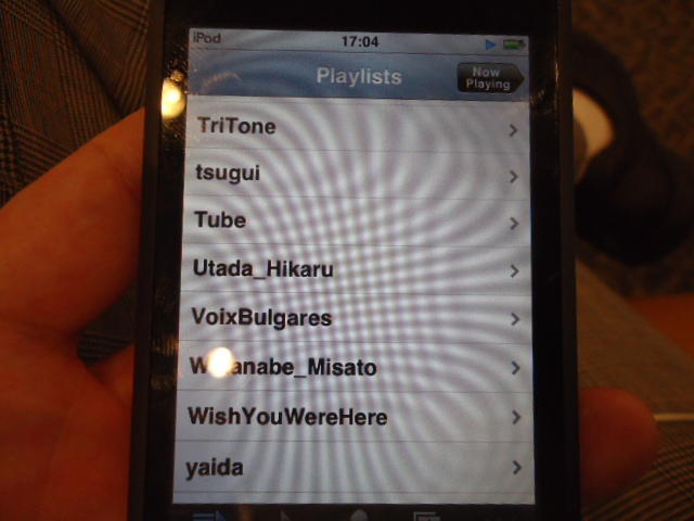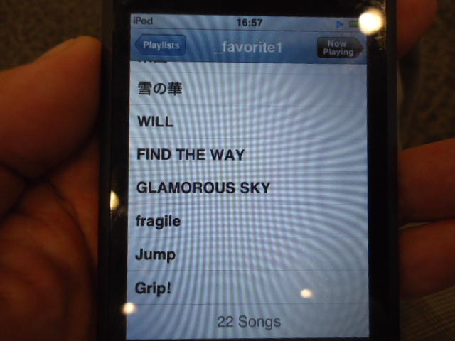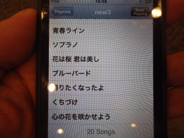 ところがその学会論文を見たパイオニアから突然にメイルが届いて、「車酔いを低減させるためにカーステレオ(パイオニアが得意な製品)の音像移動が使えないか」という受託研究に発展して、研究費をいただいて実験を進めたのです。学生は被験者として「計15分(7分+7分)ほどクルマに乗って、目をつぶって、特製コントローラのジョイスティックを、イアホンで聞いている音楽(「まけないで」)と身体感覚(右折/左折のG)が合っていれば(positive)上に上げ、違和感があれば(negative)下に下げ、どちらでもなければ脱力(→バネで中央に戻る)」という実験(協力者の報酬は15分で3000円!!)というのに応募して20人ぐらいやりました。被験者の鼻先にはCO2センサがあって、酔ったり眠気が出た被験者(→データを除外)が特定できました。ところが2年目の実験では、下級生が多数応募してきたものの、1回やった学生の応募はゼロでした。それだけストレスがあった模様です(^_^;)- 僕は新しい音楽でなくても積極的に聴きたいと思います。音楽メディアの形式や音質にはそれほど拘らなくてもそこにいる人の声を聞きたいという気持ちが強いです。音楽で様々な胸の内を表現したい一方、小市民的な立場を守りたい気持ちもあります → 「小市民的な立場」などと卑下することなく、新しくなくても自分が好きな良い音楽を愛好するというのは素晴らしいことだと思います。僕も偉そうにComputer Musicの話をしましたが、例えば海外出張で長時間のフライトの時に聞くために持参するiPod touchに入っている音楽というのは、こんなもんです。2013年に スケッチング2013 に行くために成田空港で、「サンフランシスコ行きに乗り込む長蛇の列を尻目に椅子で待っている合間に撮った、手元のiPodの曲メニューの一部」というのは ★ ★ ★ ★ ★ ★ ★ ★ ★ ★ ★ ★ ★ ★ ★ ★ ★ ★ ★ ★ ★ ★ ★ ★ ★ ★ ★ ★ ★ ★ ★ ★ ★ ★ ★ というようなもので、詳細は省略しますが、JPOPについては僕の マイリスト と数多く重複しています