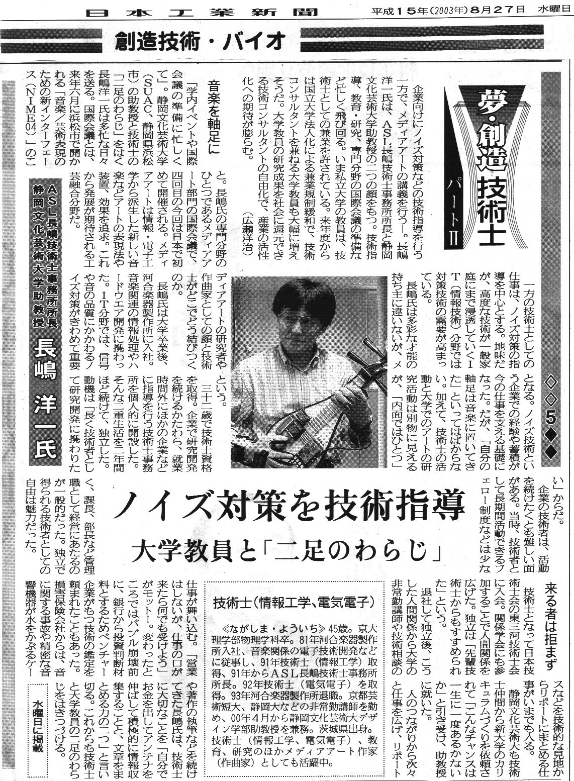 - 長嶋の活動の中心は「Interactive Live Computer Music」であり、単なる記録であるものの、これまでの作品については YouTube記録のページ があるので、興味のある人は後で参照して下さい