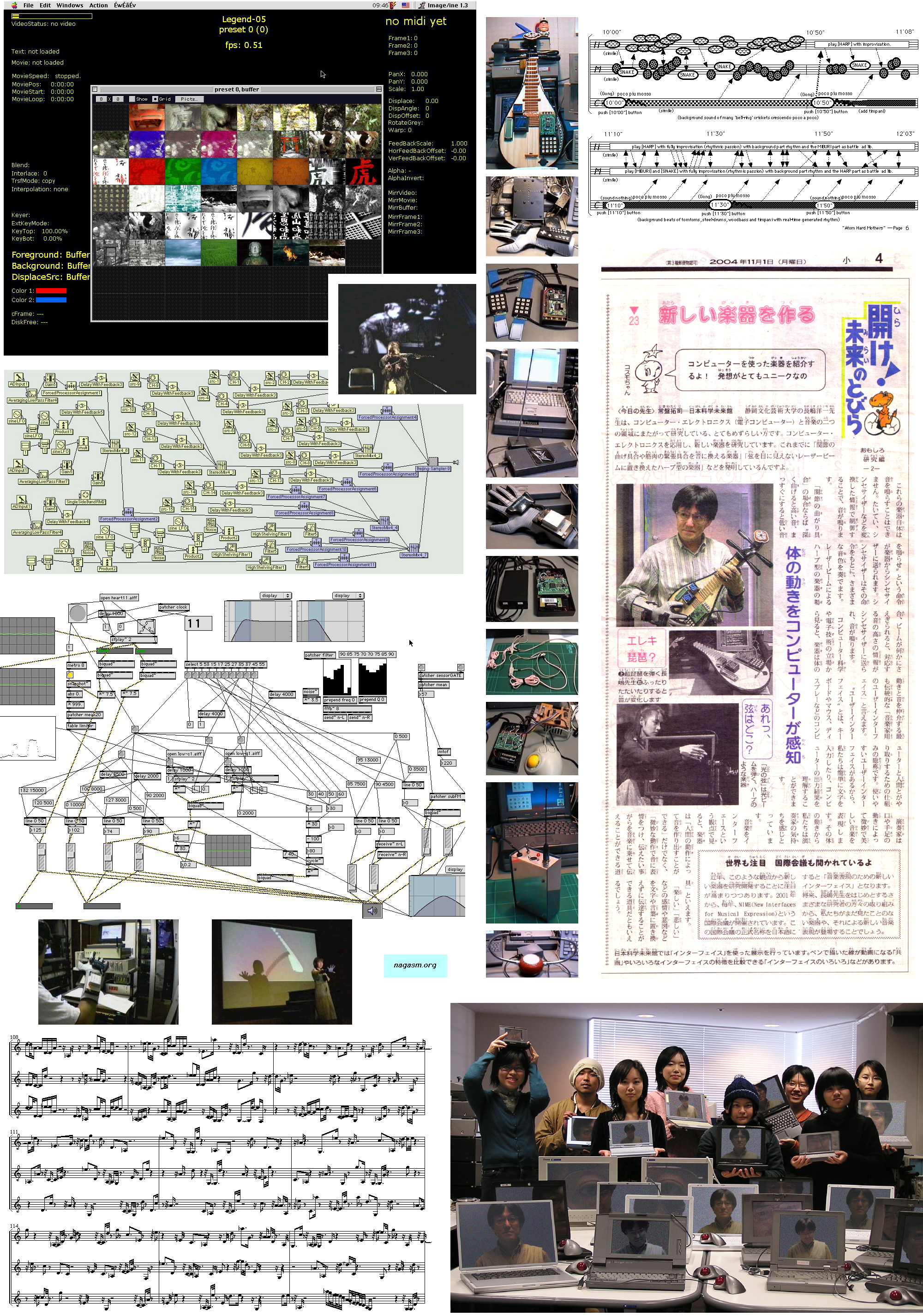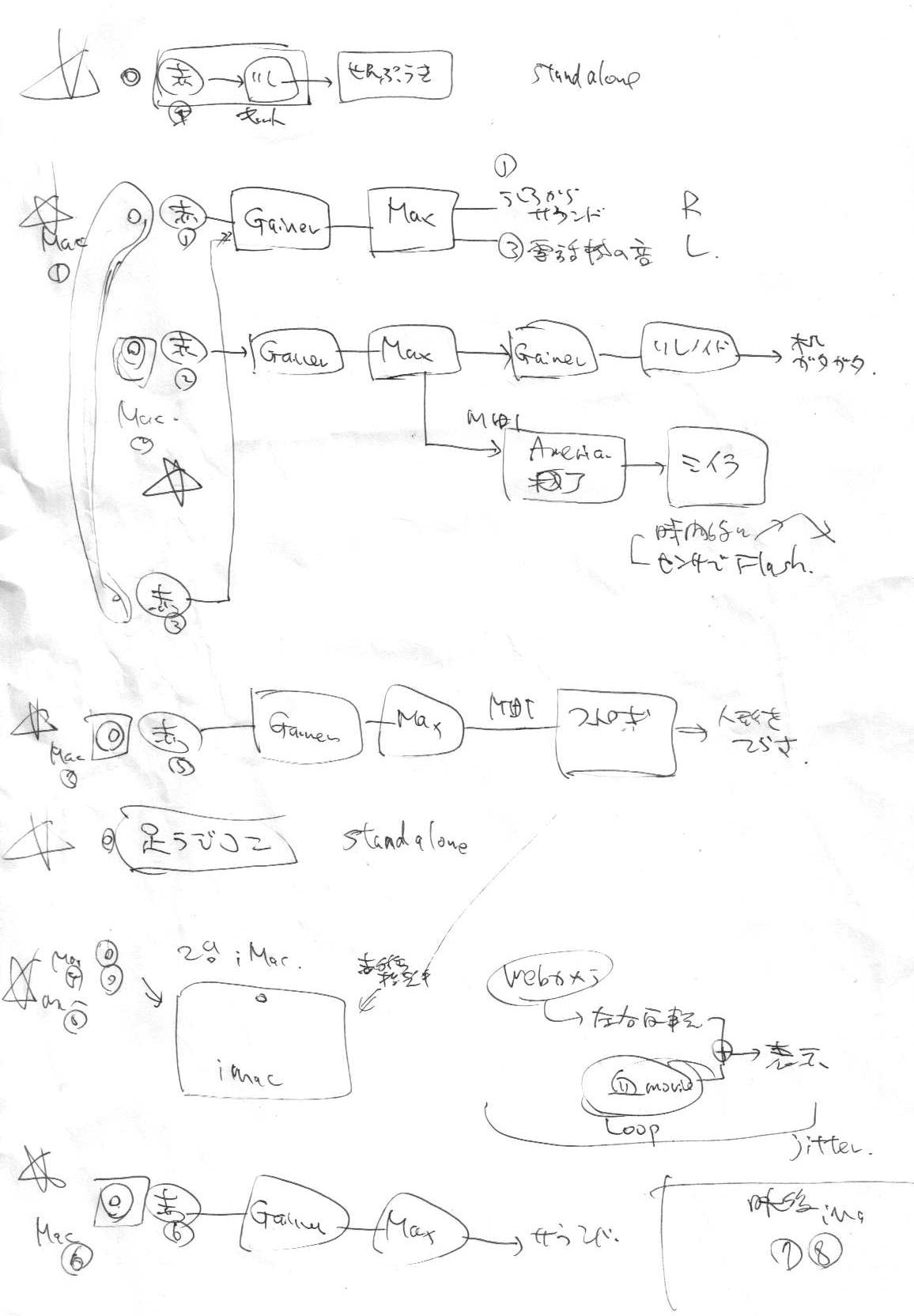 - 絵筆に何か工夫を加えることで、自由に絵を描きながら、デザインしなくてもユニークな音楽を作ることができる → 1993年の僕の作品 Muromachi (そのダイジェスト版) や翌年1994年の Muromachi2 では、ステージ上のパフォーマー(絵心のある美大の学生)が、ペンシル型マウス(このX座標とY座標が刻々と音楽系システムに与えられて「描画のサウンド」が生成されます)でアクリル板(これ越しに床に置いたモニタで自分の描く絵を確認する)の上から絵を自由に描きます。その描く絵がステージ後方のスクリーンに大きくプロジェクションされます。描画は「ライン」・「スタンプ」・「ペイント(塗り潰し)」・「エフェクト」などがあり(その都度、背景音楽も変化)、全部で3回、全画面をクリアするとパフォーマンスが終了します。なのでこの作品の演奏時間はまったく不確定で、絵を描くのにノッてくると延々と続けたりして、リハーサルが30分にもなったので、本番はちょっと短く15分ぐらいにしてもらったり・・・と自由でした