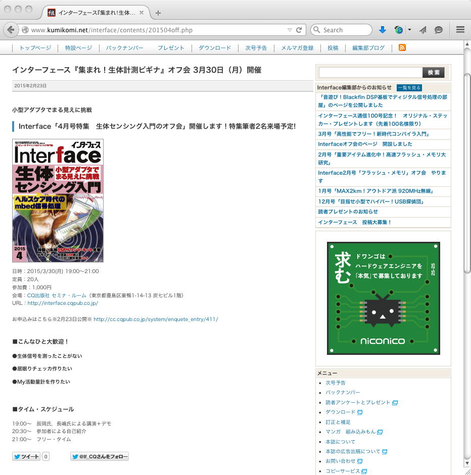 5ヶ月前、CQ出版の編集者からのメイルで始まった去年の9月26日からの mbed日記(1) 、10月27日からの mbed日記(2) を経て、11月17日からの mbed日記(3) が12月23日に終了し、このCQ出版「インターフェース」誌2015年4月号「生体情報の信号処理」特集記事が刊行されるまであと10日である。ここから話はスタートするが、タイトルの「Myo」に辿り着くのは、かなり後になりそうである。