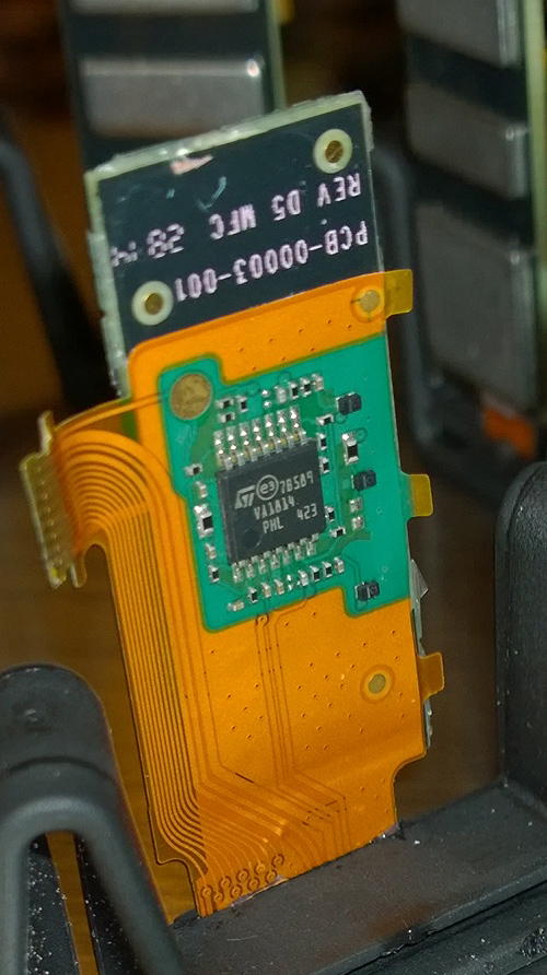 そして、筋電ユニットは、8つの電極ボックスに全て同じ、以下のようなもの(フラットケーブルのパターンだけ別)が入っている。 使われてるチップ(OPアンプ)は、ST Microelectronicsで"VA1814"と読めるものの、メーカのサイトに該当製品は無い。 ただしチップのピン配置が典型的な4個1パックなので、おそらく単純なRailtoRailのOPアンプで、一般的な3個のOPアンプを使った差動増幅回路だ、という見立てである。