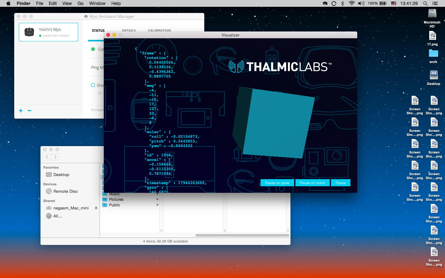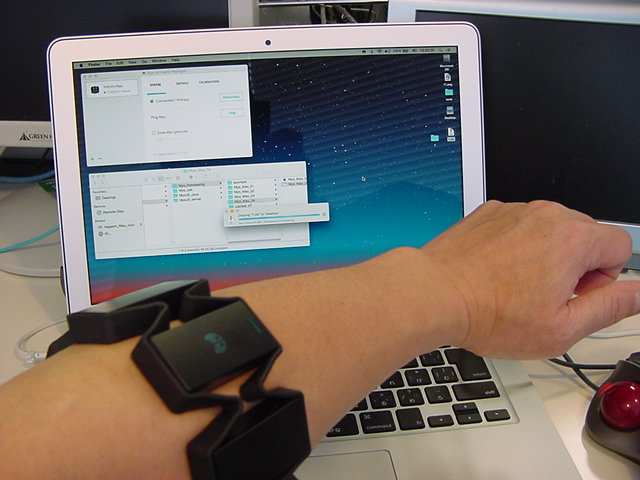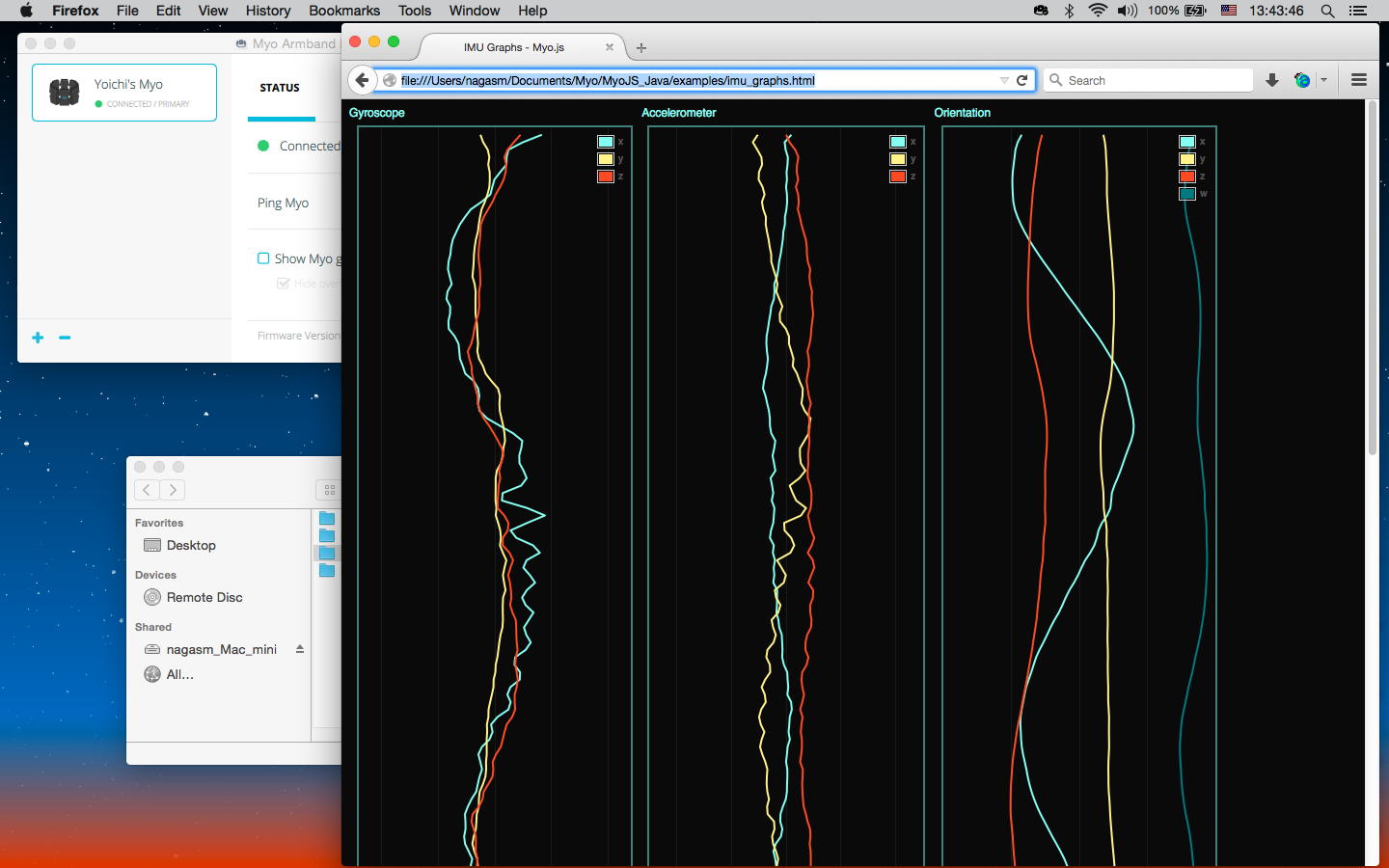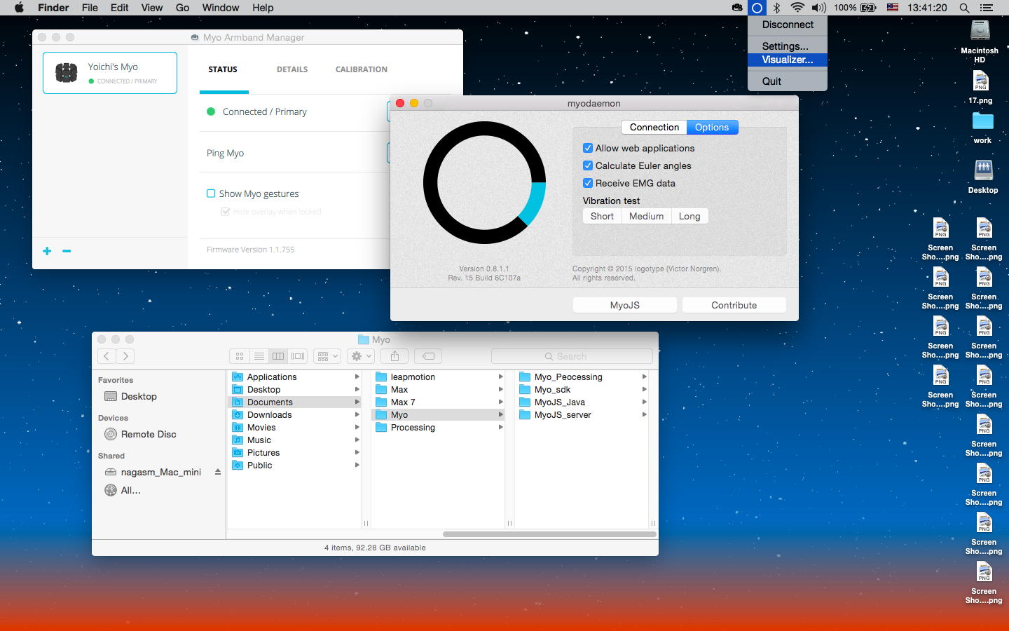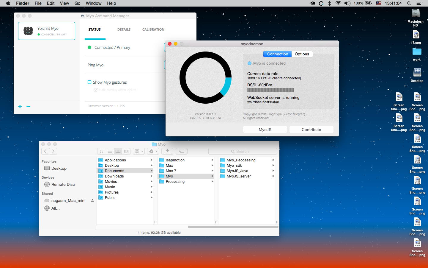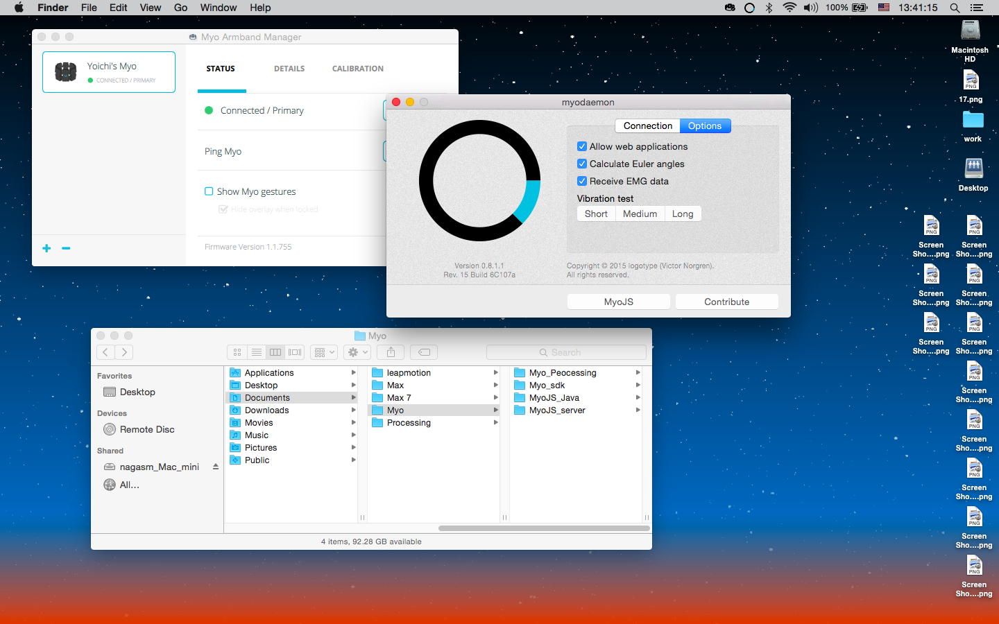 まずは、このHTMLを書いているお仕事Mac miniの横にMacBookAir3号機(Yosemite)を並べて、スクリーンショット転送用にFile共有サーバを走らせて、上のようにセッティングである。 Myoのポイントは、筋電・9軸センサ情報・ホストからの振動情報の転送にBLEを使っているところで、それとMacのBluetoothで通信するのではなく、専用のUSBドングル(青い頭の小さいやつ)がBluetooth-USBインターフェース(と正規購入Myo認証?)を兼ねている。 もし認証が無いのであれば、おいおい赤松さんのBluetooth-Maxオブジェクトが登場することだろう。