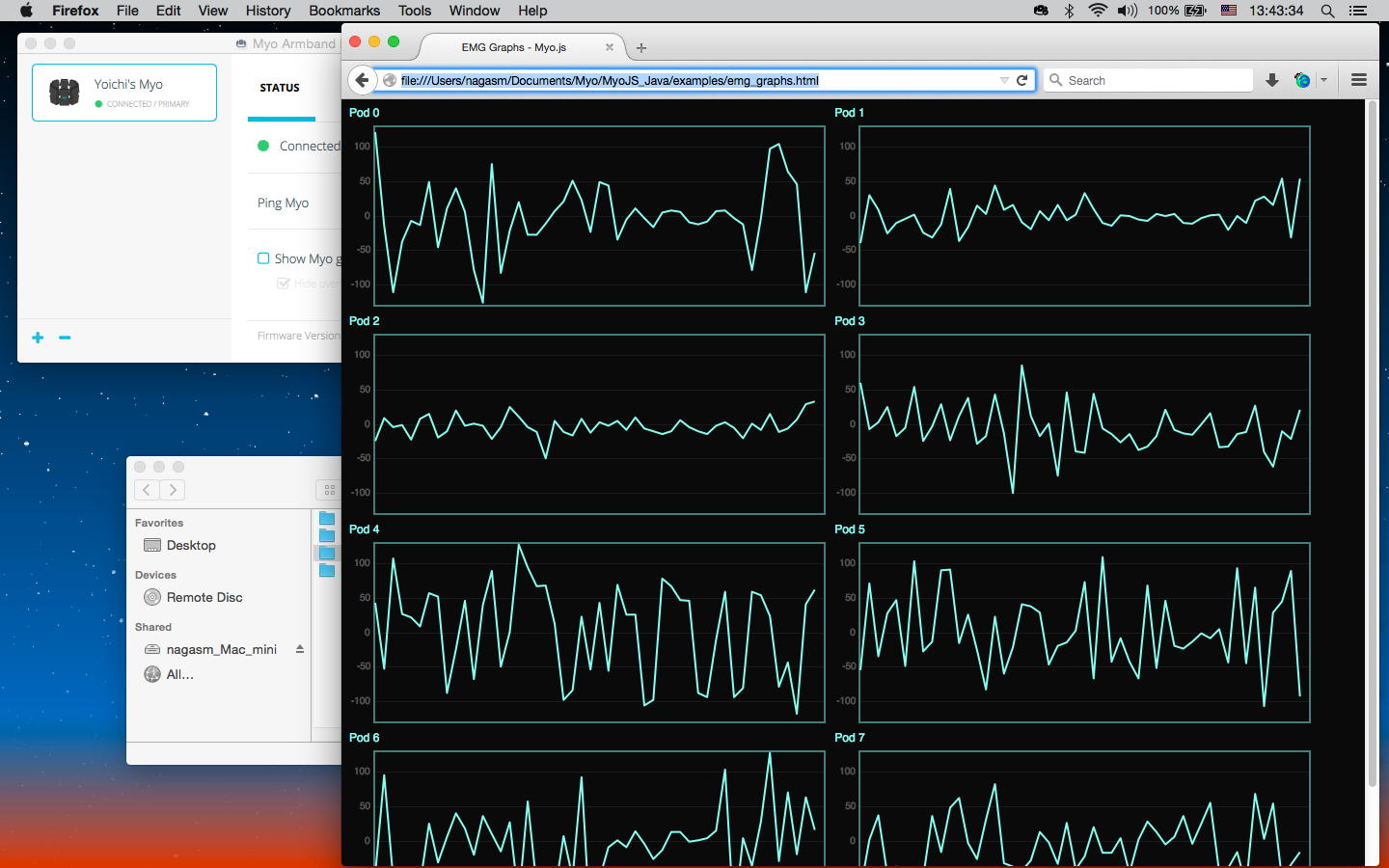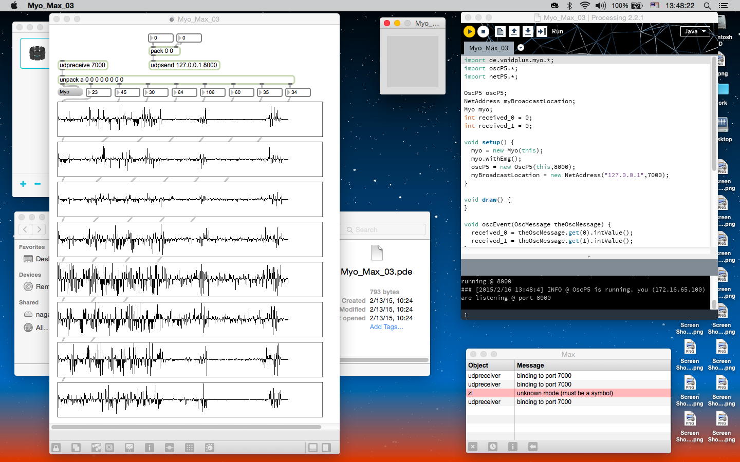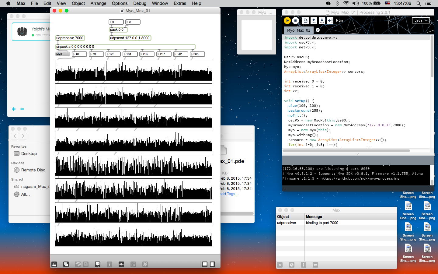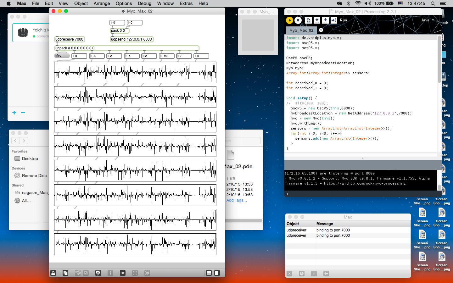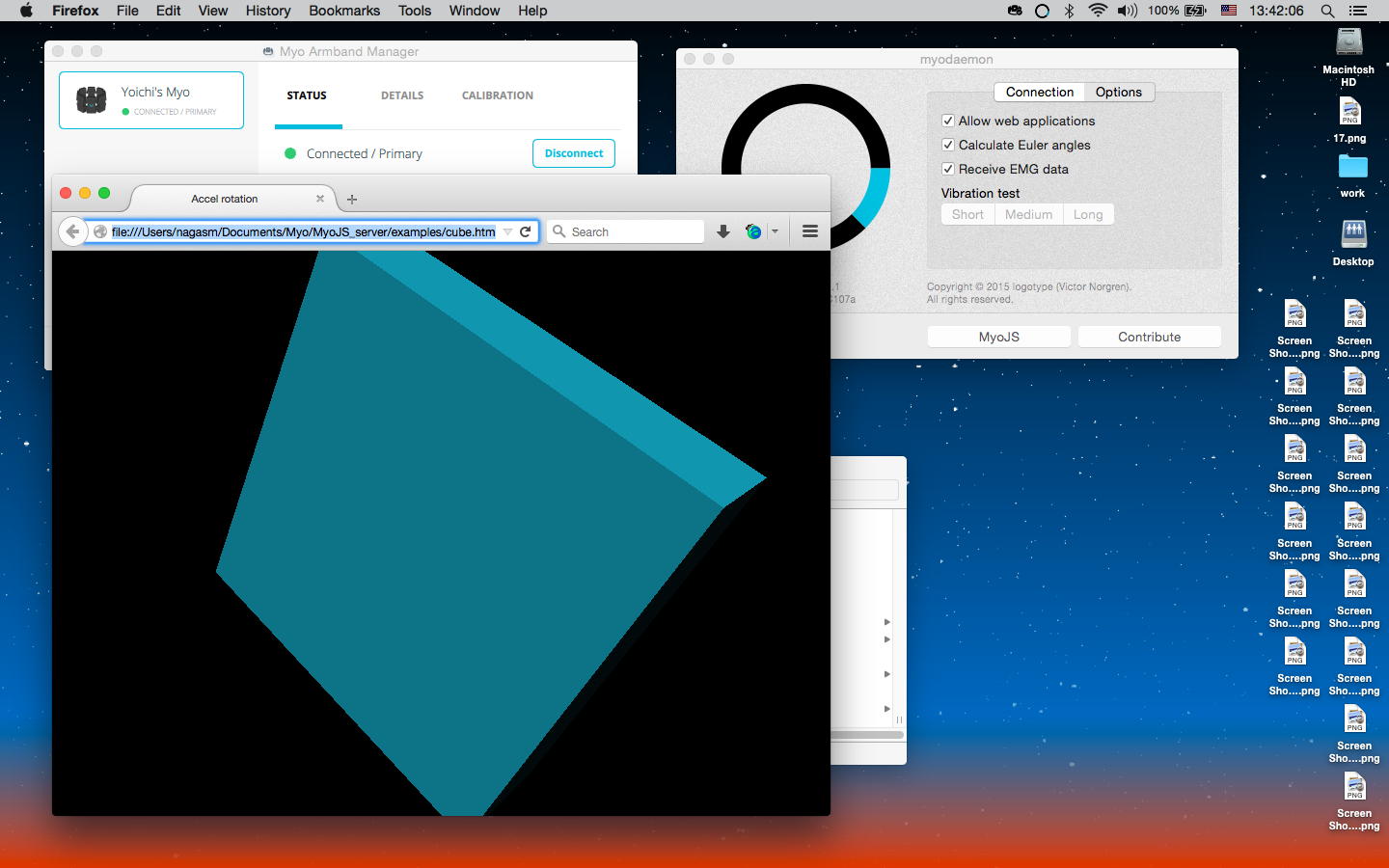 まずは、このHTMLを書いているお仕事Mac miniの横にMacBookAir3号機(Yosemite)を並べて、スクリーンショット転送用にFile共有サーバを走らせて、上のようにセッティングである。 Myoのポイントは、筋電・9軸センサ情報・ホストからの振動情報の転送にBLEを使っているところで、それとMacのBluetoothで通信するのではなく、専用のUSBドングル(青い頭の小さいやつ)がBluetooth-USBインターフェース(と正規購入Myo認証?)を兼ねている。 もし認証が無いのであれば、おいおい赤松さんのBluetooth-Maxオブジェクトが登場することだろう。