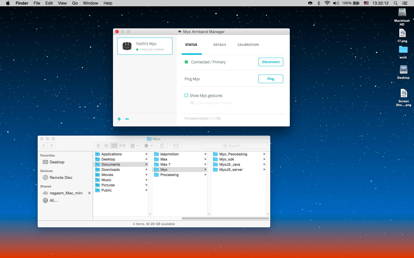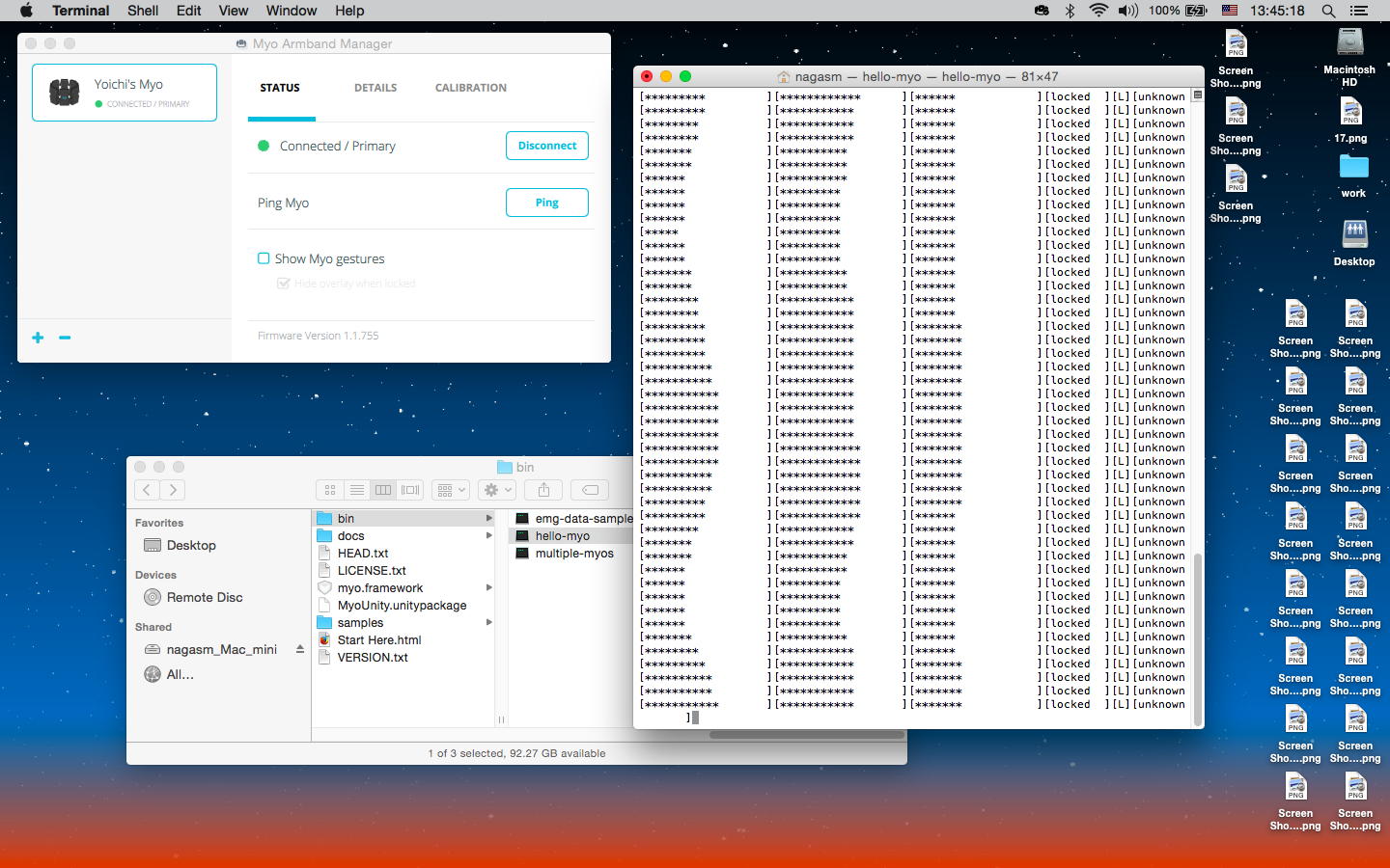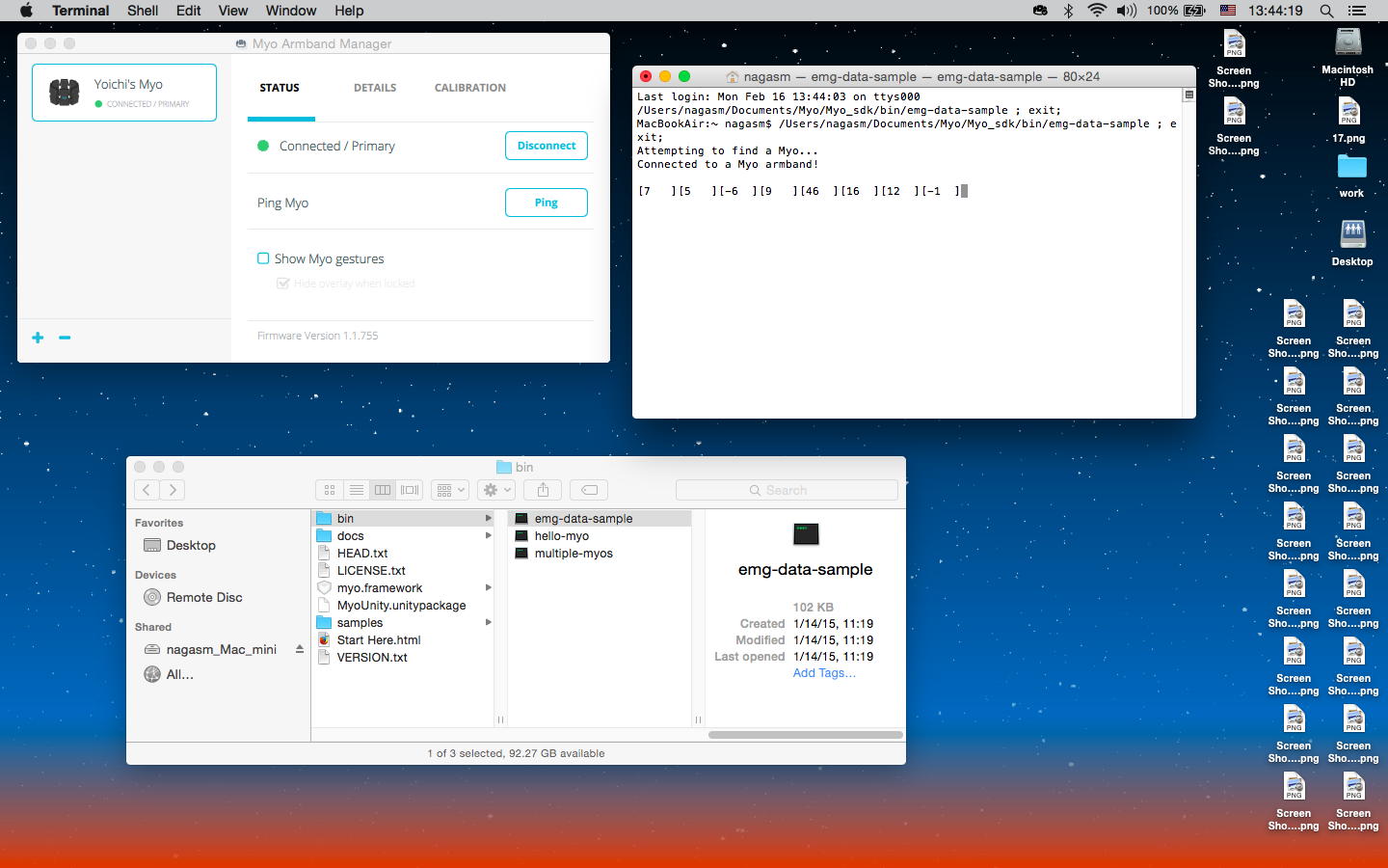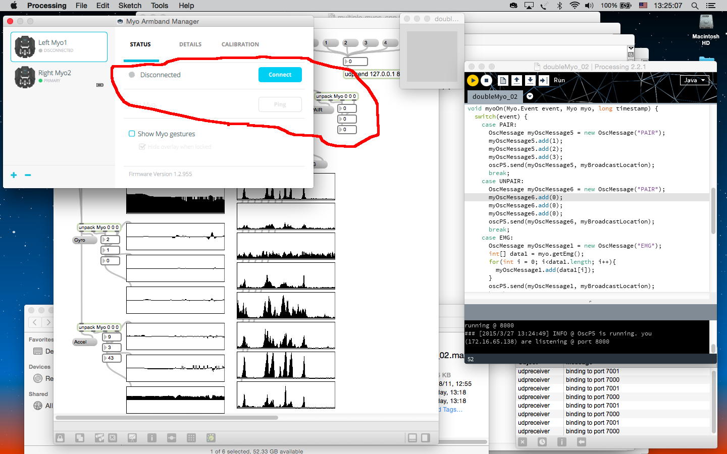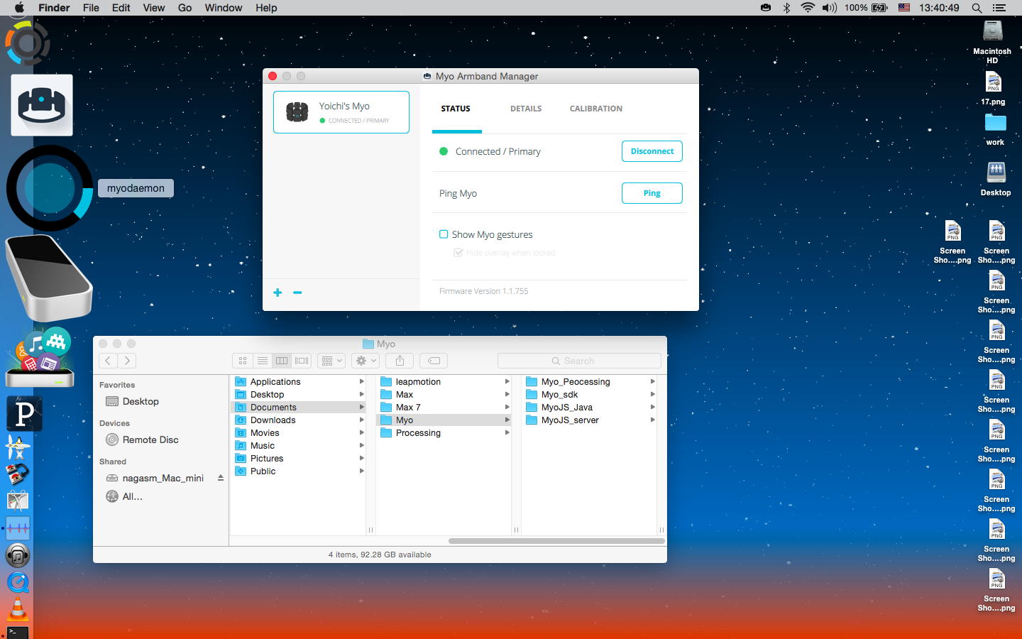 まずは、このHTMLを書いているお仕事Mac miniの横にMacBookAir3号機(Yosemite)を並べて、スクリーンショット転送用にFile共有サーバを走らせて、上のようにセッティングである。 Myoのポイントは、筋電・9軸センサ情報・ホストからの振動情報の転送にBLEを使っているところで、それとMacのBluetoothで通信するのではなく、専用のUSBドングル(青い頭の小さいやつ)がBluetooth-USBインターフェース(と正規購入Myo認証?)を兼ねている。 もし認証が無いのであれば、おいおい赤松さんのBluetooth-Maxオブジェクトが登場することだろう。