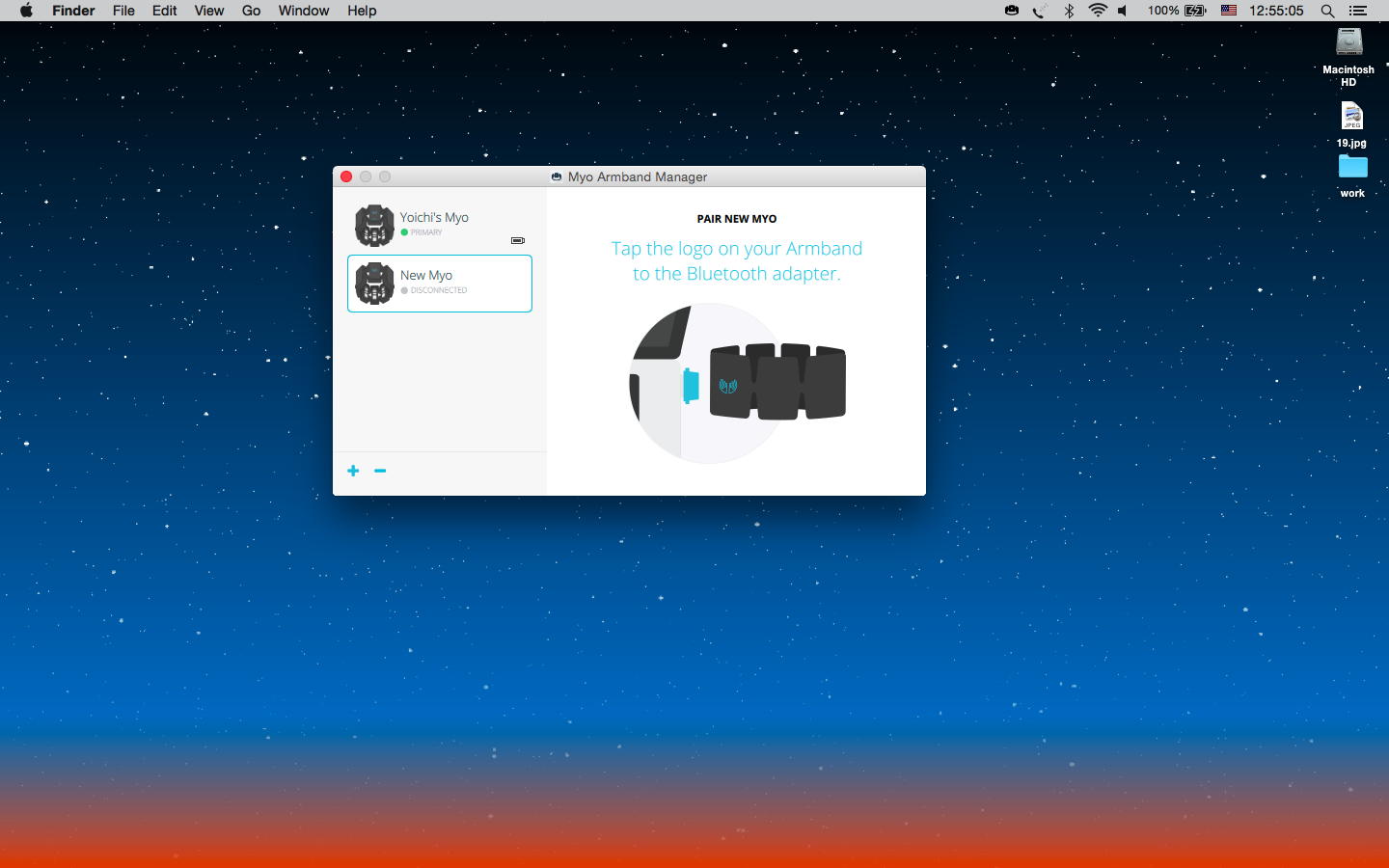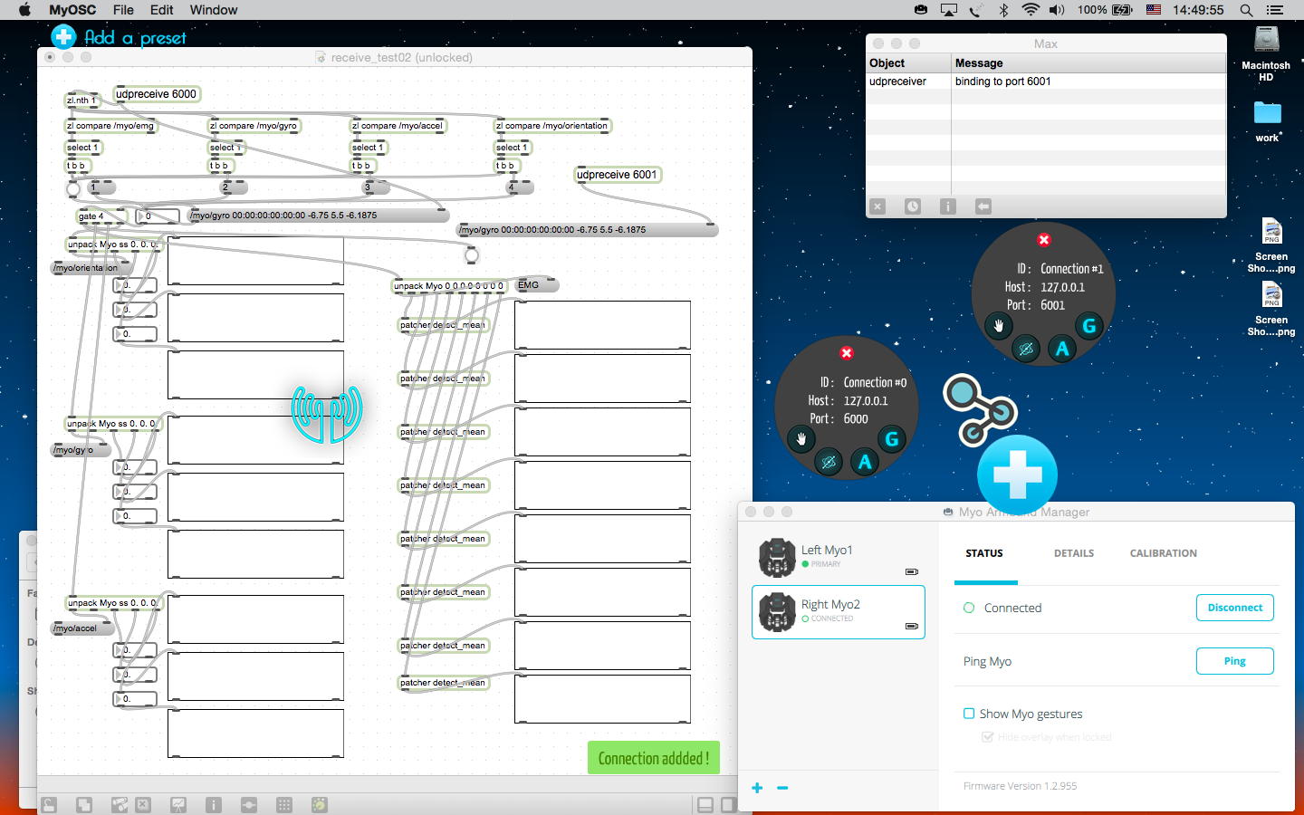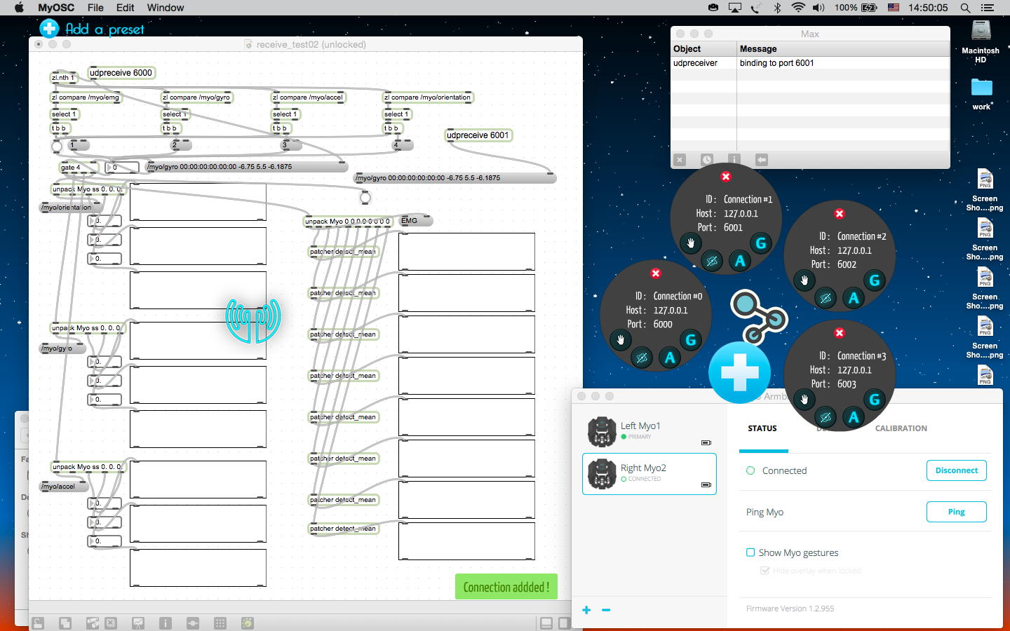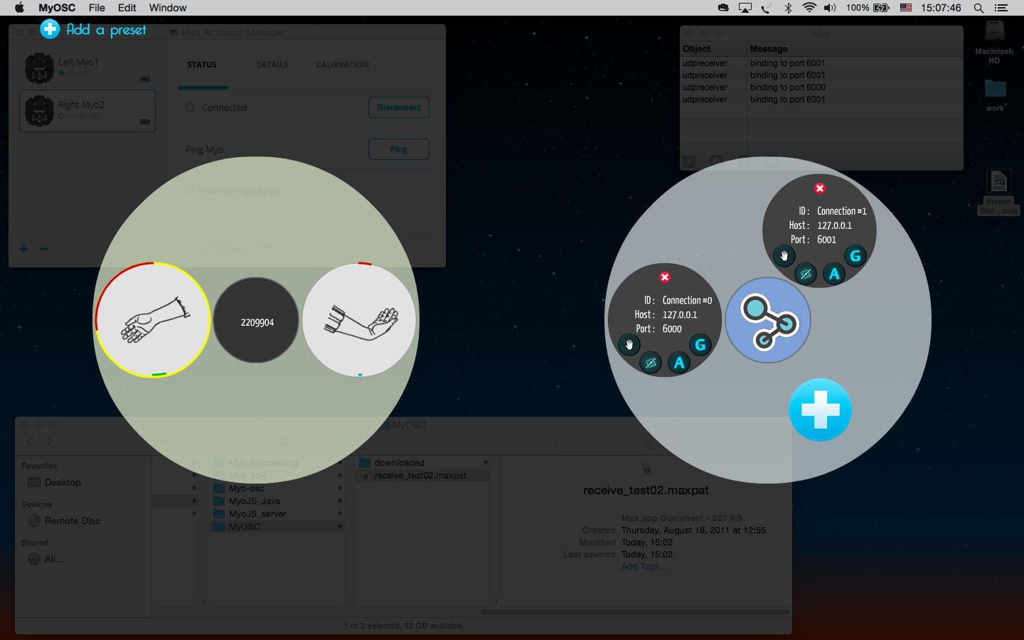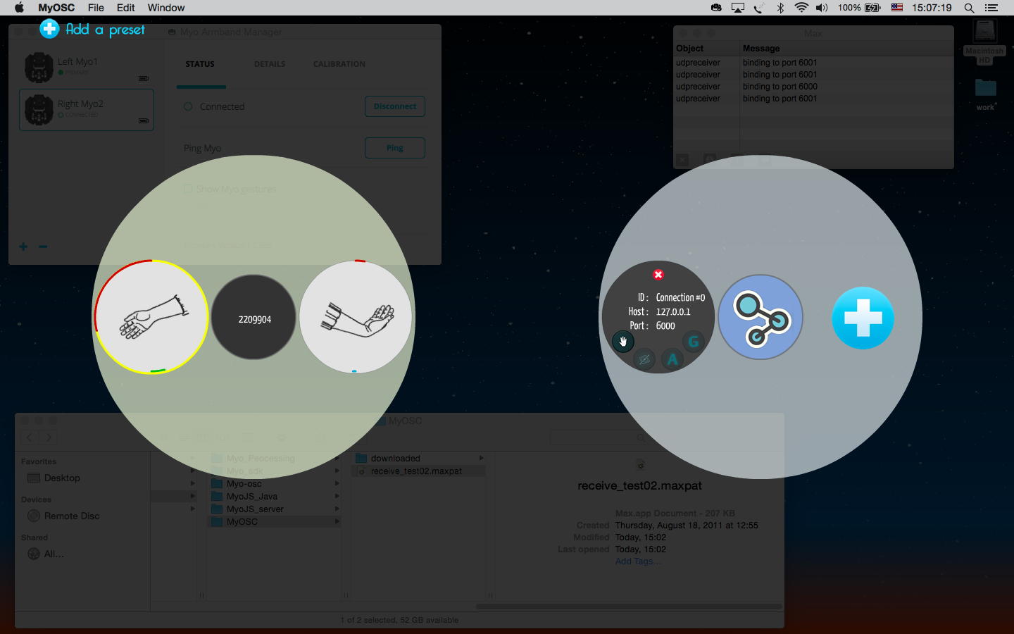 まずは、このHTMLを書いているお仕事Mac miniの横にMacBookAir3号機(Yosemite)を並べて、スクリーンショット転送用にFile共有サーバを走らせて、上のようにセッティングである。 Myoのポイントは、筋電・9軸センサ情報・ホストからの振動情報の転送にBLEを使っているところで、それとMacのBluetoothで通信するのではなく、専用のUSBドングル(青い頭の小さいやつ)がBluetooth-USBインターフェース(と正規購入Myo認証?)を兼ねている。 もし認証が無いのであれば、おいおい赤松さんのBluetooth-Maxオブジェクトが登場することだろう。