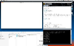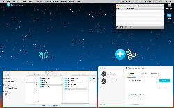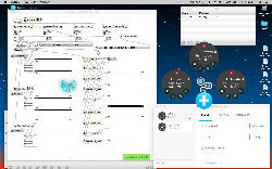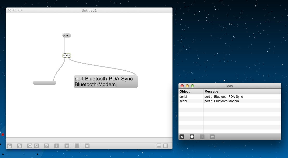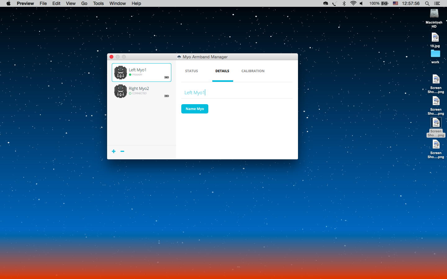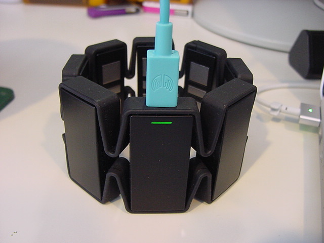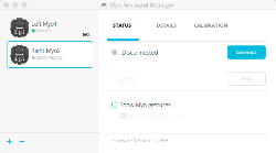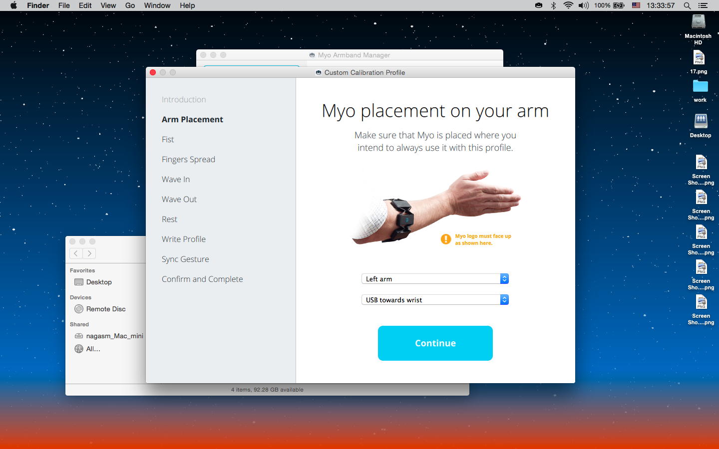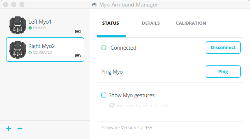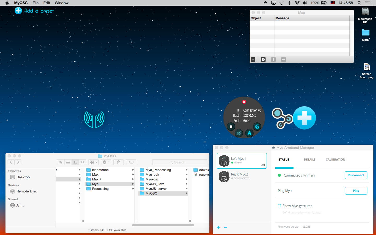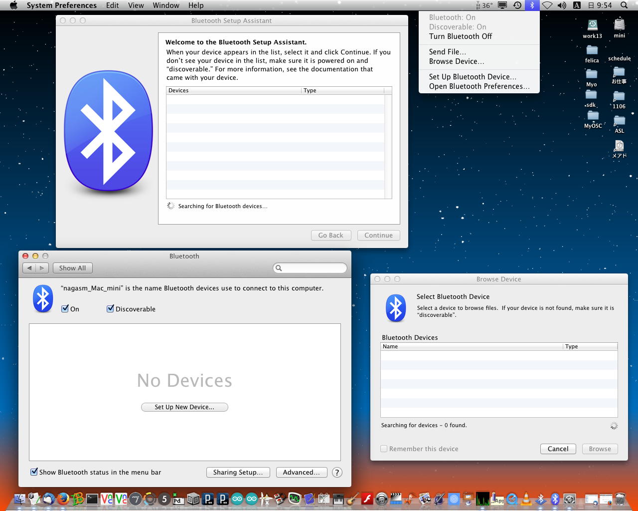 まずは、このHTMLを書いているお仕事Mac miniの横にMacBookAir3号機(Yosemite)を並べて、スクリーンショット転送用にFile共有サーバを走らせて、上のようにセッティングである。 Myoのポイントは、筋電・9軸センサ情報・ホストからの振動情報の転送にBLEを使っているところで、それとMacのBluetoothで通信するのではなく、専用のUSBドングル(青い頭の小さいやつ)がBluetooth-USBインターフェース(と正規購入Myo認証?)を兼ねている。 もし認証が無いのであれば、おいおい赤松さんのBluetooth-Maxオブジェクトが登場することだろう。