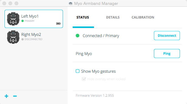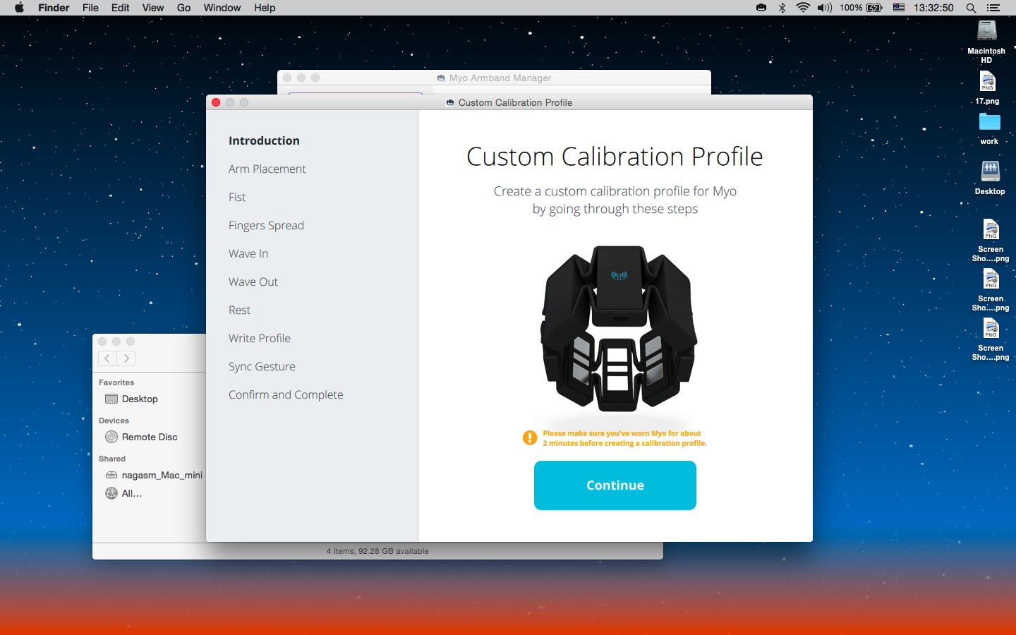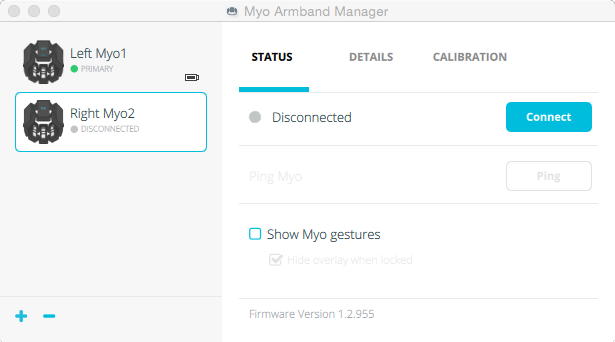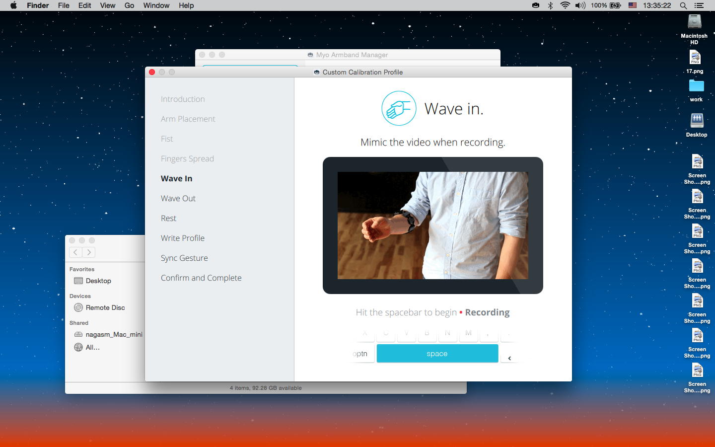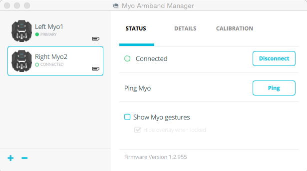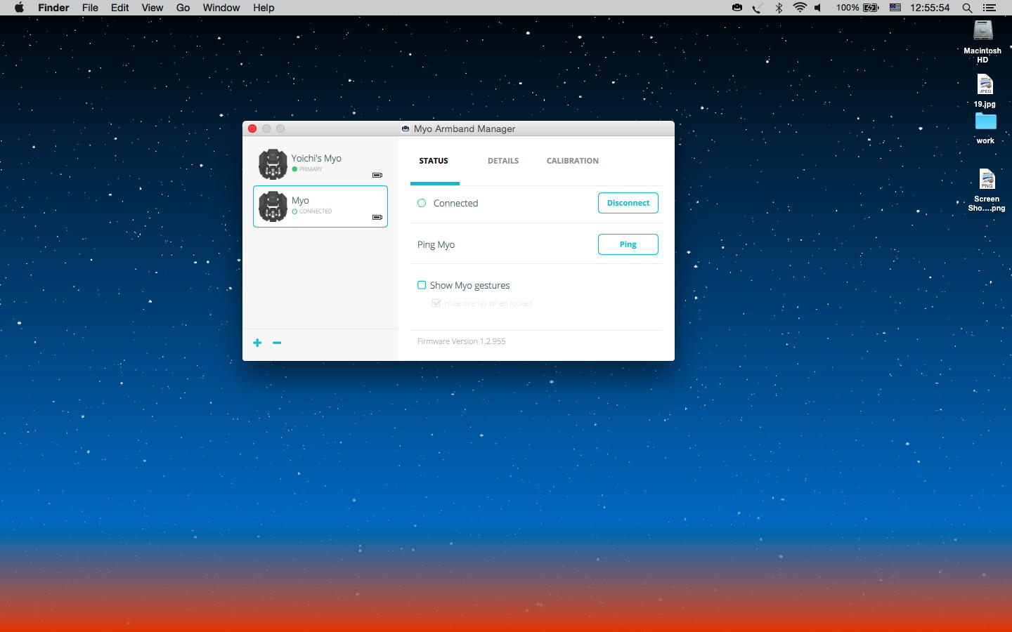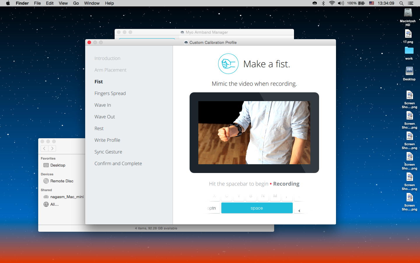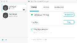 Downloadページ にある、上の「Myo Connect for Mac 0.8.1 (Jan 15, 2015)」というのが、この専用のUSBドングルを経由してMyoと通信するインターフェースになっていて、 Unofficial Tools は全て、基本的にこの「Myo Connect」と通信することでMyoを活用するためのTool群を構成している。 「Myo Connect」は単にMyoと通信するだけでなく、以下のように「CARIBRATION」メニューから画面の指示に従って、「グー」「パー」「手首曲げ」「手首反らし」「脱力」の5ポーズを設定すると、Myoに学習したパターン認識のパラメータを送信して、以降はMyoから筋電センサの生データだけでなく、5種類のポーズ情報を受けとることも出来るようになる。 指定された「2分間」、ベルトを付けて待っていると(OKになると自動でMyoからバイブが来る)、この5ポーズについてはほぼ確実に区別して認識できる。 以下のYouTube動画は、 Myoとleap motionのテスト のものとほぼ同じだが、こちらはちゃんと2分間以上たっていたので、ジェスチャ認識はとても良好である。