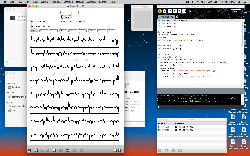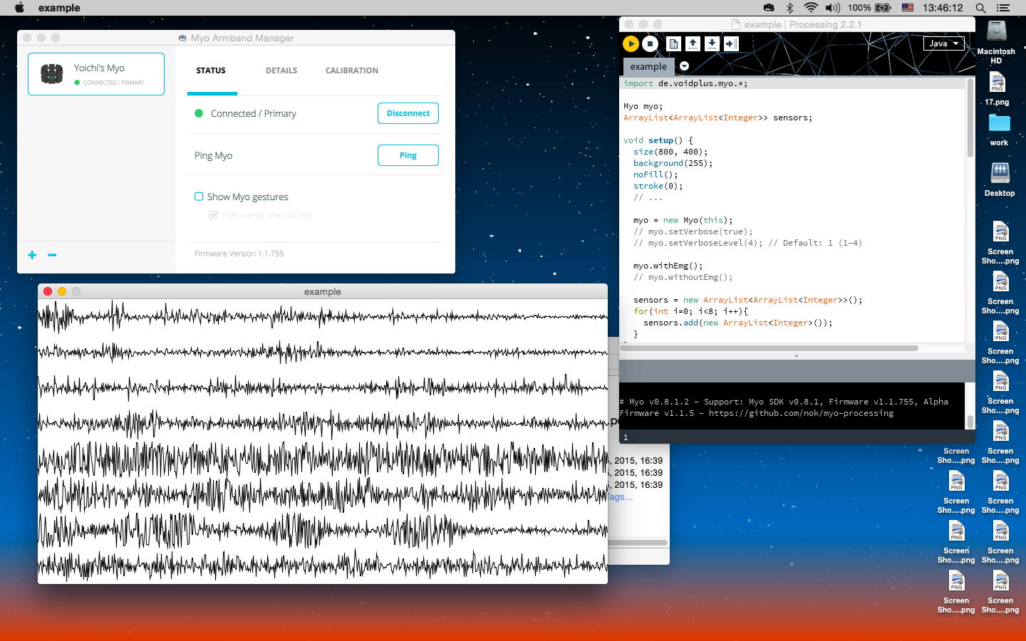 そこでUnixシェルも断念バーグして、最後に挑戦したのが myo-processing である。 サンプルの Processingプログラム を走らせてみると、上のようにちゃんと8チャンネルの筋電信号が表示された。 ここまでは、 Myoとleap motionのテスト のいちばん下にあるYouTube動画でやった事であり、新しいのはここから先である。