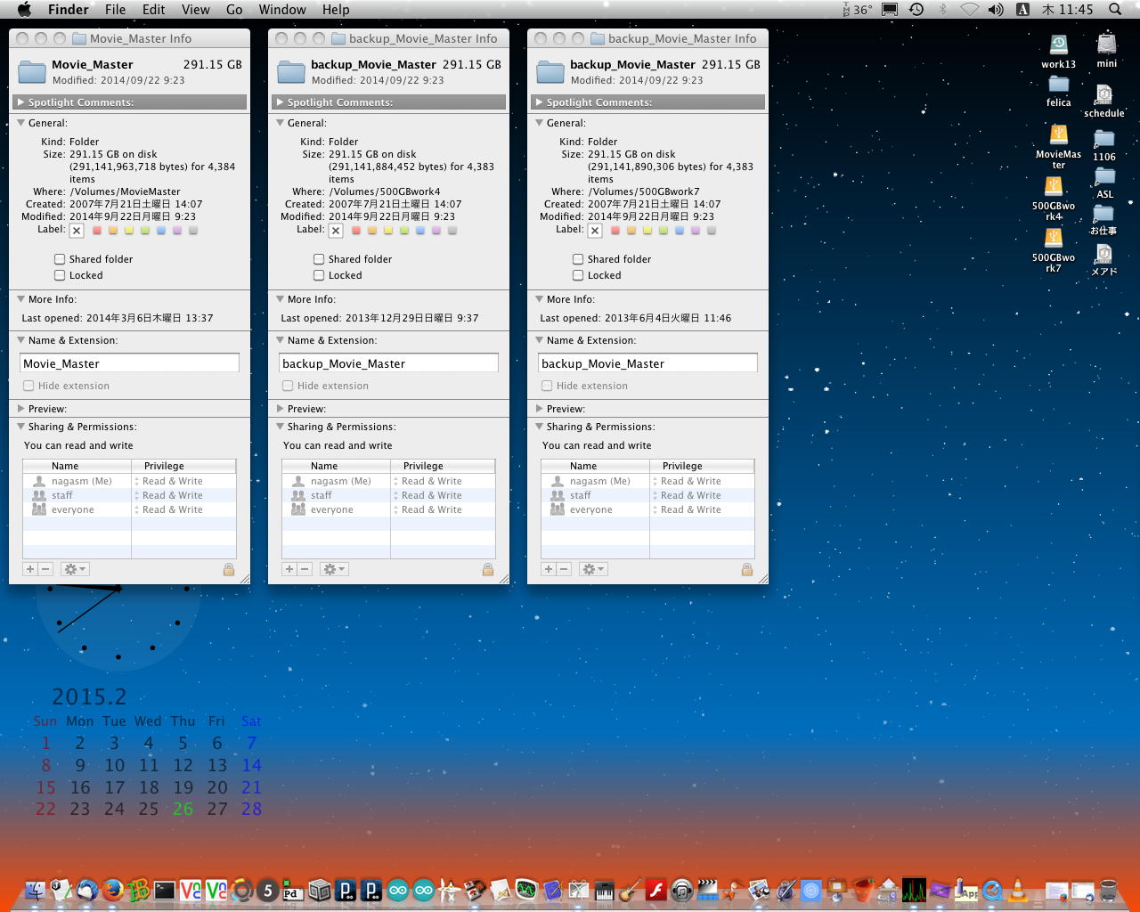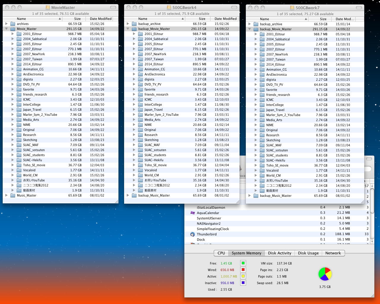 こんな時期でないと出来ないので、昨日の午後から今日の午前までかけて、卒展図録に付録のDVDからメディア造形学科学生作品をムービーとして取り込んでMP4に圧縮したり、上のように教材用ムービーHDDとその2つのバックアップに整理格納したりしているうちに、午前は終ってしまった。 3個のHDDの中身は同じ筈なのに、微妙に容量とかファイル数が違っているのは「誤差」である(^_^;)。