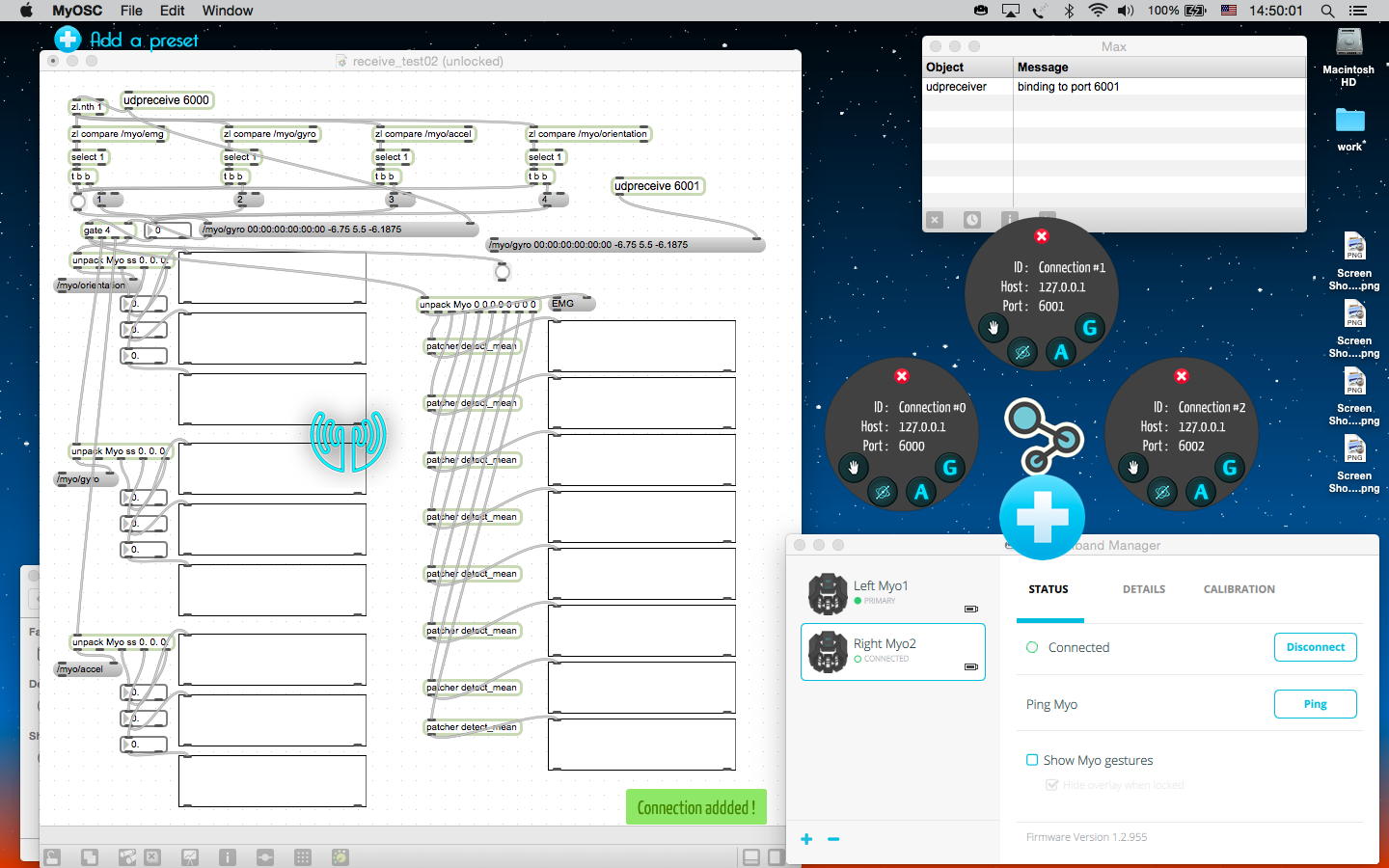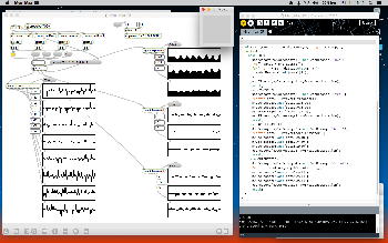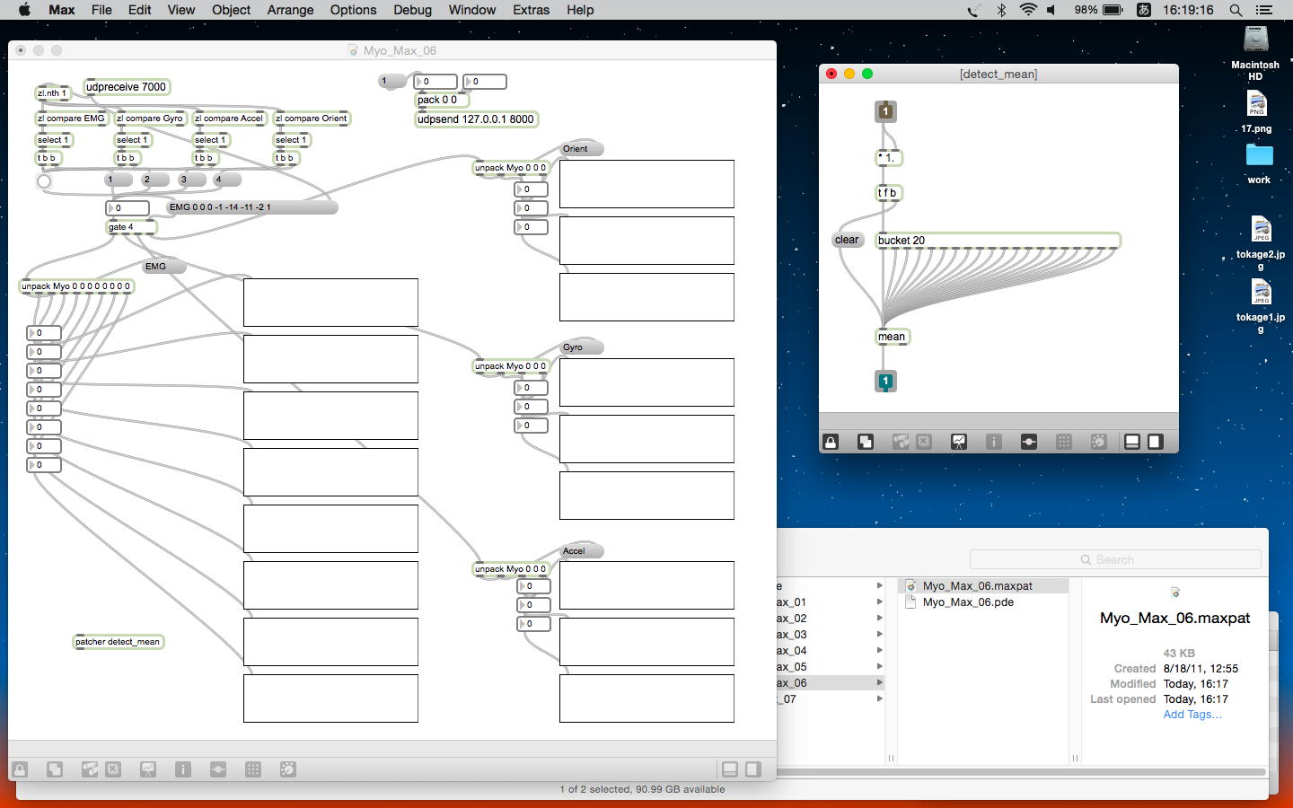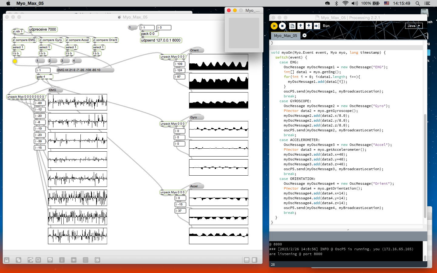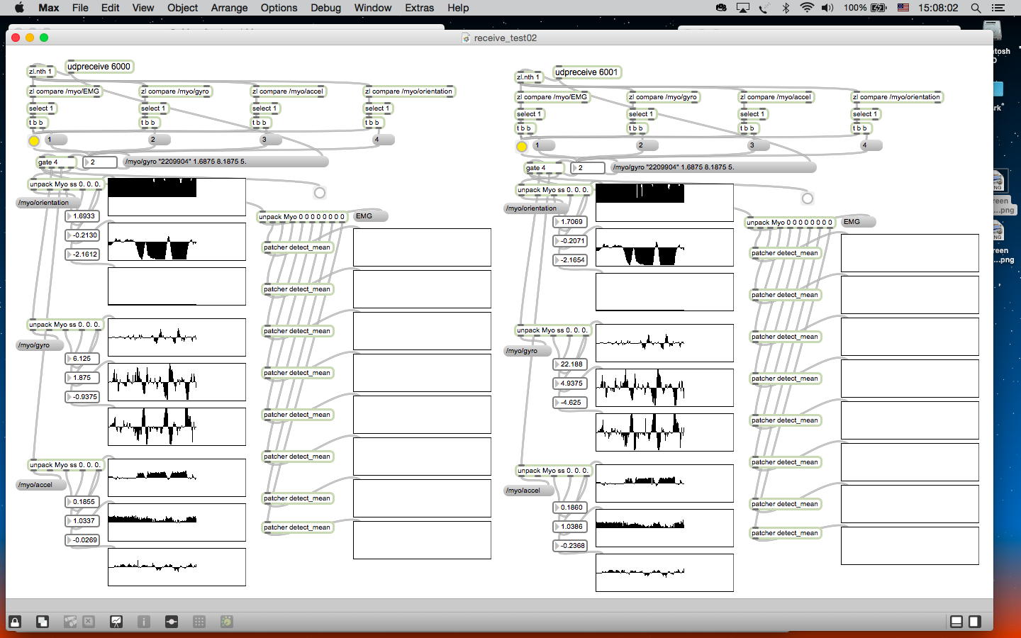 Myoの Unofficial Tools のページの上のリストから、「使えそう」なものを探す、というのが最初の作業となった。 ここで「使える」というのはもちろん、「Maxで使える」ことを意味する。 去年の Max日記は、 Part2Part3Part4 まで、半年ちょっとで終っていた。 すっかり忘れていたが、いちばん最後にはjitterでネットワーク経由の動画伝送までやっていたようである(^_^;)。 leap motionもようやくMac OSX 10.10ということで使えたが、こちらはもう赤松さんのMaxオブジェクトでの動作を確認したので完了である。(^_^)