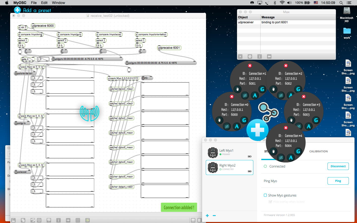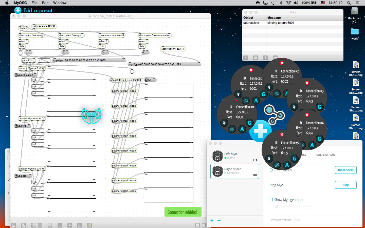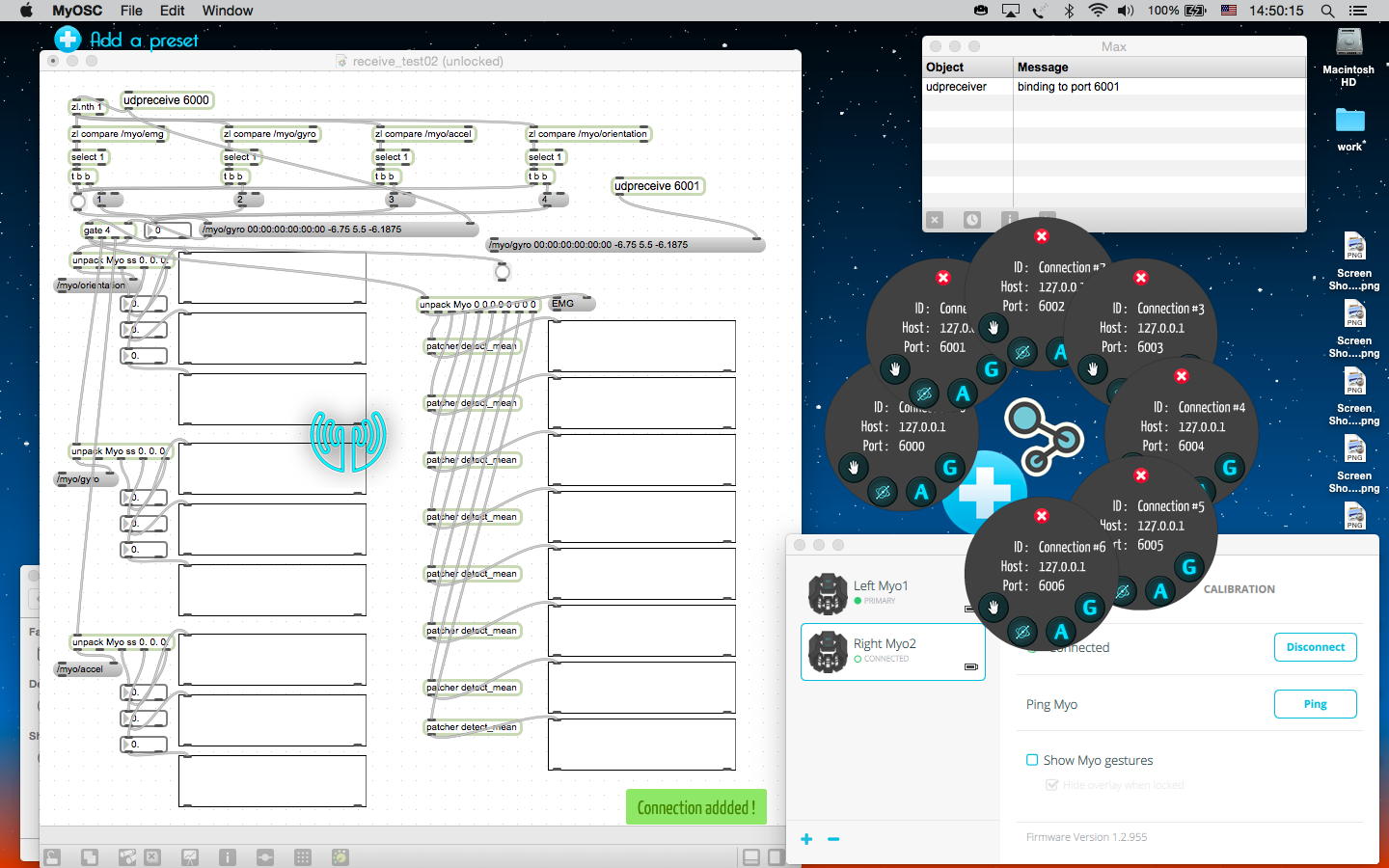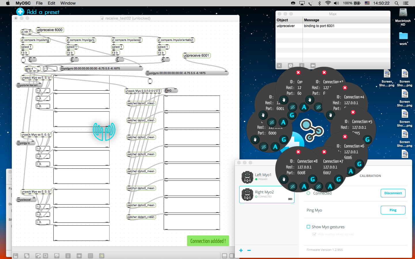 Myoの Unofficial Tools のページの上のリストから、「使えそう」なものを探す、というのが最初の作業となった。 ここで「使える」というのはもちろん、「Maxで使える」ことを意味する。 去年の Max日記は、 Part2Part3Part4 まで、半年ちょっとで終っていた。 すっかり忘れていたが、いちばん最後にはjitterでネットワーク経由の動画伝送までやっていたようである(^_^;)。 leap motionもようやくMac OSX 10.10ということで使えたが、こちらはもう赤松さんのMaxオブジェクトでの動作を確認したので完了である。(^_^)