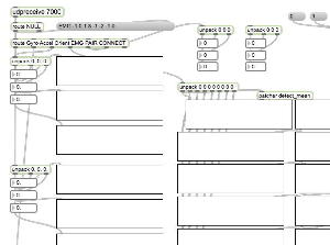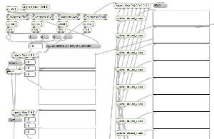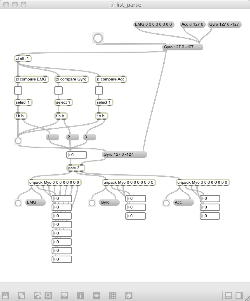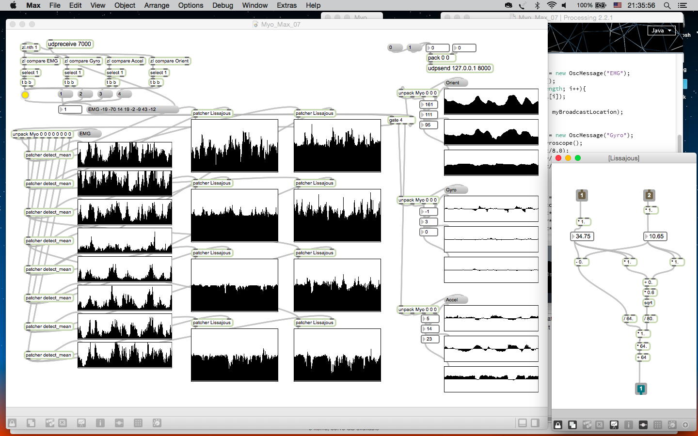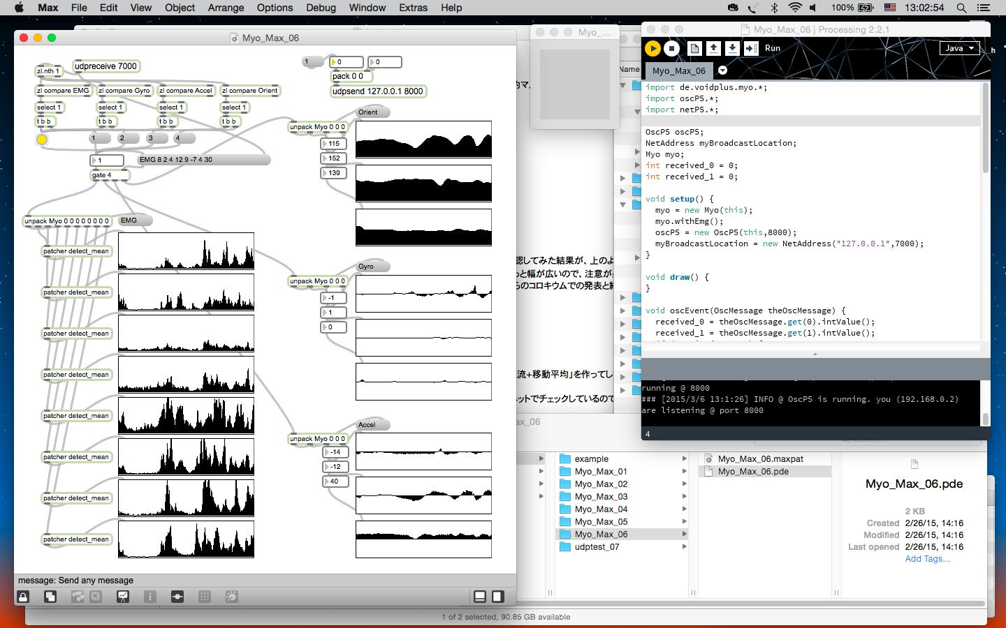 MyoとProcessingが繋がったとして、ここからMaxとどう繋ぐか・・・というのが「壁」となる筈なのだが、どっこい、既に僕にとって「MaxとProcessing(とSuperCollider)とは、OSCで連携するお友達」だったのだ(^_^)。 3年半前に、 Processing日記(4)SuperCollider日記(6) のあたりでやっていた事を、まずは発掘した。 思い出しのスタートラインは、 udptest_07 というMaxパッチとProcessingスケッチである。 これらは更にSuperColliderとOSC連携しているが、それは無視しても大丈夫である。