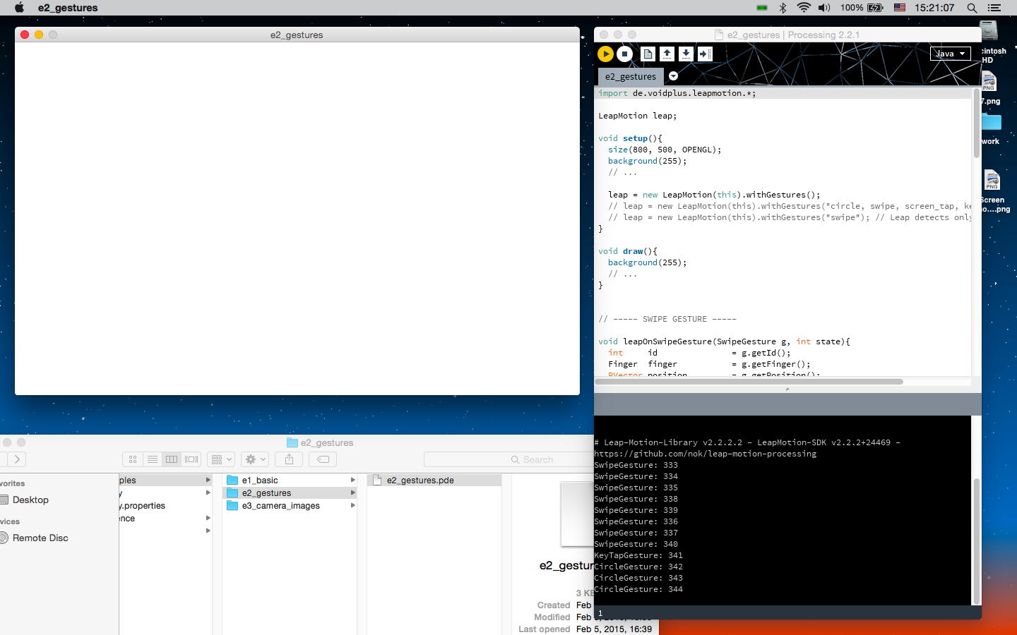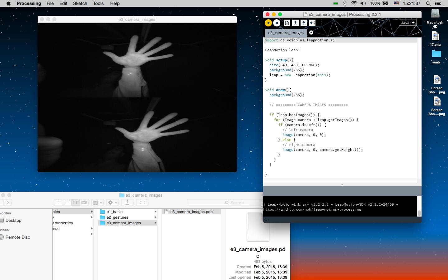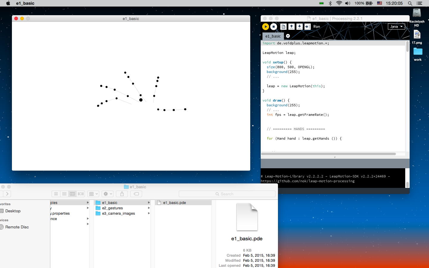 ・・・そしてここから、上記のリンクをそれぞれ辿ってみたところ、ライブラリが不足して叱られたり単なる情報ページだったりした中で、最初の ここ だけが以下のように、無事に環境インストールから3種類のサンプル実行まで上手くいった。 何より素晴らしいのは、このProcessingスケッチは、leap motionから提供されている「leap motionコントローラ」を起動しなくても動く、というところで、つまり、(WebSocketサーバのような?)面倒なルートを使っていないのである。(^_^)