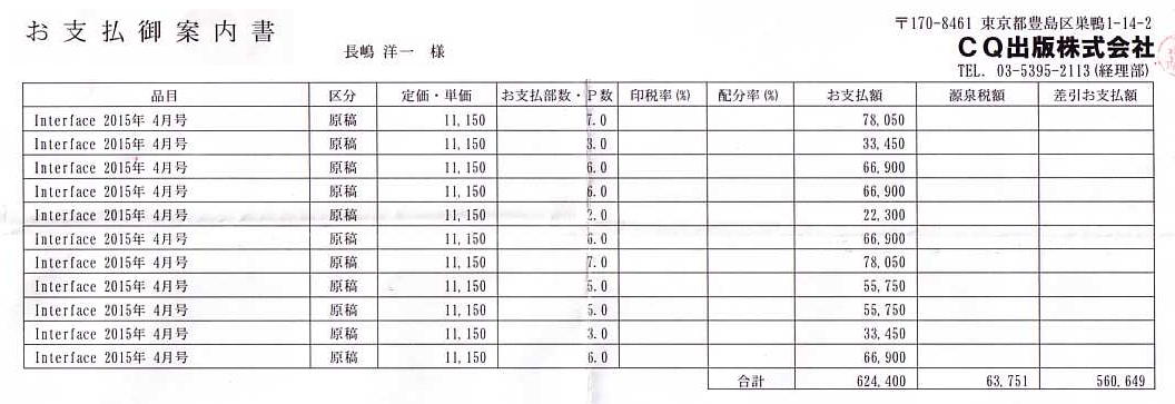そして午後、遂に上のようにCQ出版から、明後日2/25に発売される「インターフェース」が届いた(^_^)。 さっそく このように Webに上げた。 来月号の巻末「でばっぐ」で訂正するほどのミスは無かったが、102ページ右段の最後から6行目に、突然に「USBオーディオ治具」という単語が出てきていた。 これは校正の途中までは、解説の原稿が生きていたのに、最終的に消えた(^_^;)ものである。 仕方ないので、 このページ に補足をあれこれ追加した。 「Max」の解説とか、せっかく書いた「BITalino」「e-Health」の原稿もそのまま置いた。 これでようやく、今回の執筆も終了である。
