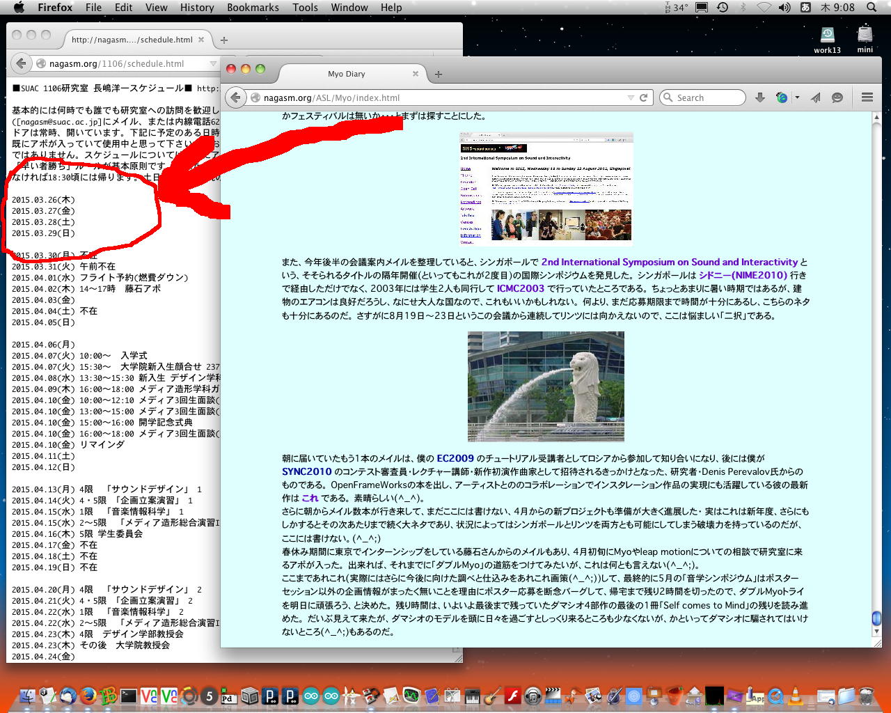 さっそく遊んでみたいが、2月に入っていよいよ、 このように  CQの記事の第1校が続々と届いて、 校正作業 に追われたり、さらに依頼されて、今度はたった一人で 追加ビデオ記録 を撮ったりしたが、その合間に、とりあえず Myoのサイト から Developerのページ に行き、ここの Downloadページ から最新のMyoファームウェアを落としてインストールして動作を確認すると、さらに Unofficial Tools というソソラレル場所を発見していくつかのデモ/ツールを落として、またまた藤石さんを誘って Myoとleap motionのテスト などをやってしまった。 leap motionは購入してから9ヶ月ほど放置していたが、昨年末に新しいMacBookAir(Yosemite)を買ったので、ようやく動かすことが出来た。 既に赤松さんのMaxオブジェクトが公開されていて、これはもうびしばし使える事を確認した。 その後さらに 怒濤の校正作業 が続き、合間には 9作品の記録を追加 したり、 1回生の映像作品パーティ があったり、と追われて、Myoが1106の机上にあるのになかなか手を出せない日々が続いたのである。