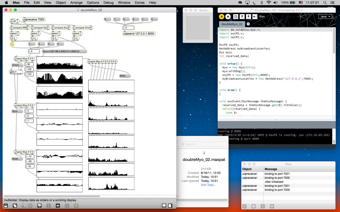 2時間ほどあれこれ試行錯誤して、初めて触れるProcessingの「PVector」というやつもなんとか解読して、上のように全ての情報をMyoから受けとってOSCで送るProcessingスケッチと、対応したMaxパッチ Myo_Max_05 が完成した。 表示されているMyo情報は、