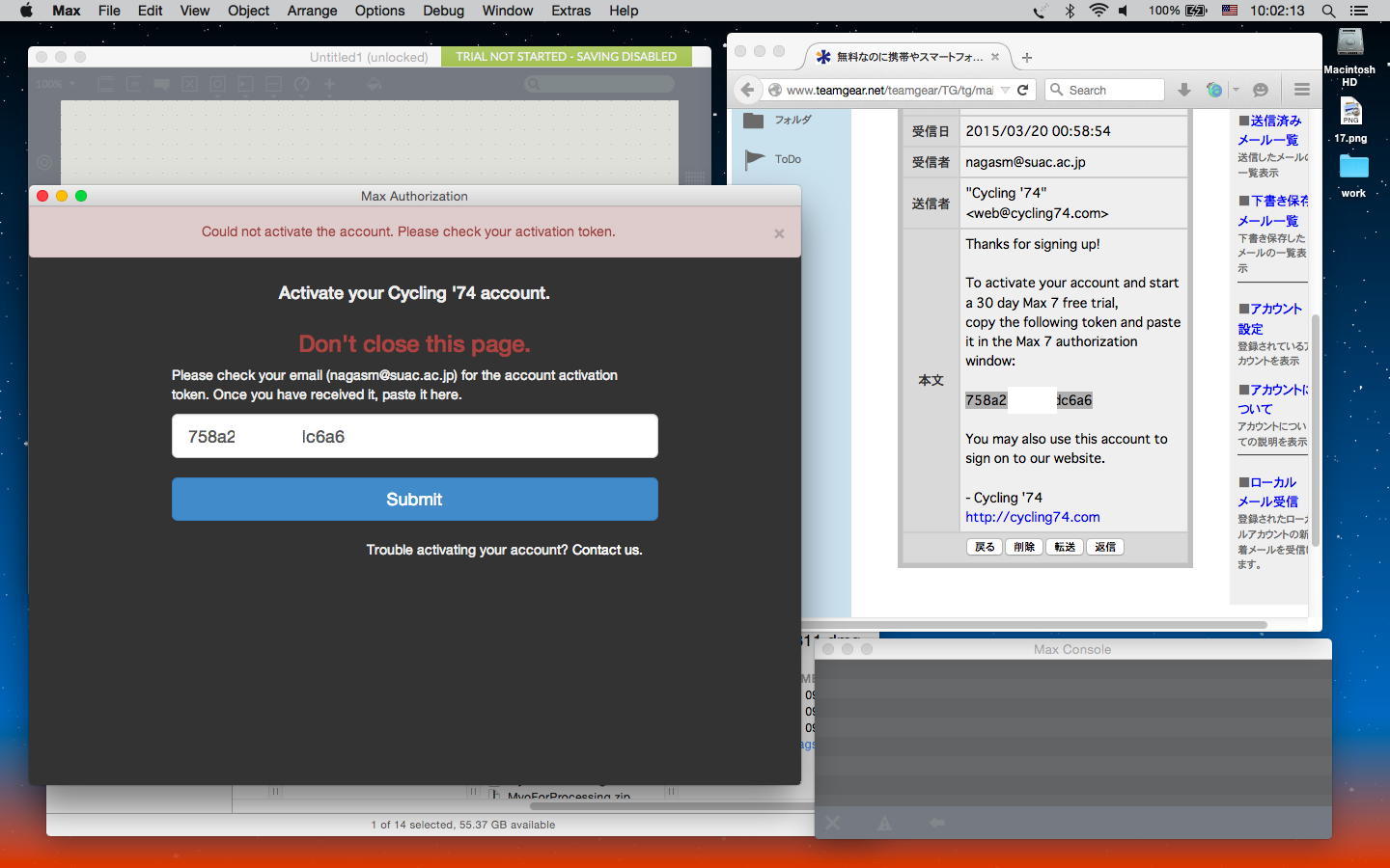 既にメイルのやりとりは49本、実験用に提供されたパッチをMax7で走らせてテストするYosemiteのスクリーンショットPNGも17枚になるが、このところ10日以上、先方のMax7プログラム改訂を待っているところなのである。 既にダウンロードしているMax7をモバイルWiFiルータとか出張先のホテル(インターネット素通し)でオンライン購入するのは簡単なのだが、この1106の新しいMacBookAir(Yosemite)は、1年後のSUAC導入作業のためのシミュレーションとして、あくまでSUACネット内からproxyを経由してインストール検証したいので、Max6.1.9を別途に入れてまで、ひたすら「待って」いるのだ。