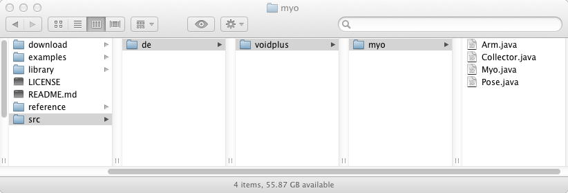 ここらが、 Myo.javaCollector.java とを置き換えたもので表現できるのか・・・ということである。 とりあえず、これらのバックアップを確保した上で、Processingでインポートされる筈の、 ここ にある以下の2つのJavaプログラムを変更したらどうなるか、から実験してみた。