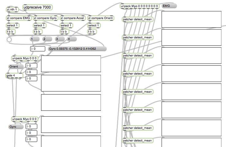 上のMaxパッチ(部分)は、MyoからBluetoothを受け取ってMaxにOSCで送るProcessingスケッチと対応した、MaxでのOSC受信(解釈)部分である。 ProcessingからのOSCパケットは、先頭に「EMG」とか「accel」とかのキーワードがあり、ここにデータが続く、というメッセージとして受け取る。 僕はこれを、まず「zl nth 1」で先頭キーワードを抽出して、それを「zl compare」でいちいちキーワードと比較して番号を出し、入力メッセージを貯めていたバッファから出力する「gate」の振り分けに使っていた。 馬鹿正直というのは、こういうのを言う(^_^;)。