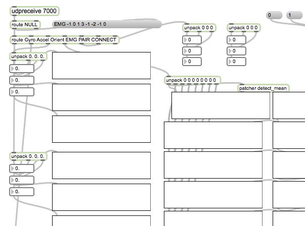 そして最初の実験として成功したのが、上の Myo_Max_01 である。 ここではまだ何も判っていないので(^_^;)、とりあえず「udptest_07」と「サンプル」をそのまま合体させているが、ちゃんとOSCを経由して筋電情報がリアルタイムにMaxに引き渡された。