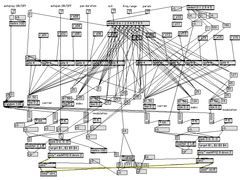 This shows the sub-patch of the work for the "FM synthesis" part. This FM algorithm is designed by Suguru Goto and distributed by himself in DSPSS2000 in Japan. The multiband filters were also used in this work.