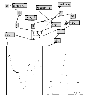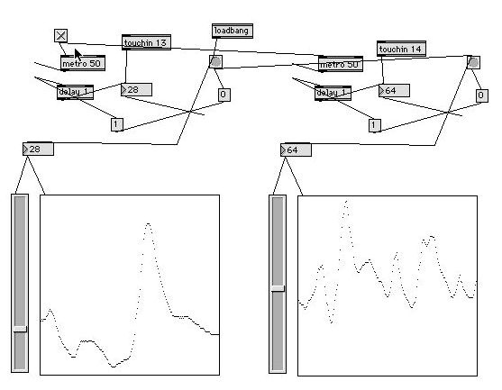 This is the Max/MSP screen of the MIDI output of this sensor. 8channels + 8channels electromyogram signals are all displayed in real time, and used for sound generating parameters. The maximun sampling rate of this sensor is about 5msec, but this sampling rate is changed by the host system for its ability of MIDI receiving.