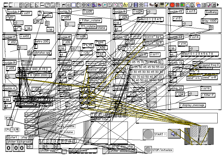 Below shows the main patch of Max/MSP for the work "BioCosmicStorm-II" in running mode. There are 16 real-time display windows of 16 channel EMG inputs. Below shows the same patch in editing mode. The 16 sensor outputs were mapped into "sinusoidal synthesis" part of this work is programmed in this main patch using the Hide-mode objects.![]()