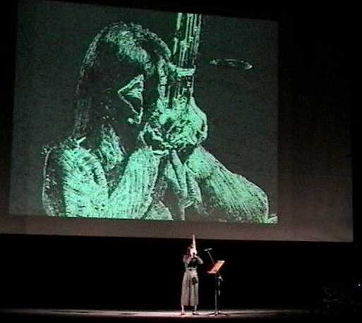 This bi-directional SHO breath sensor is originally produced by myself, and used by Japanese SHO performer/composer Tamami Tono Ito. The "Breathing Media" project is her own. I have composed interactive multimedia art called "Visional Legend" which was performed in Kassel (2 concerts) and Hamburg in September 2001 (above). She composed some works using this sensor, and Figure 20 shows the work "I/O". Her breath controls both sound synthesis and live graphics.