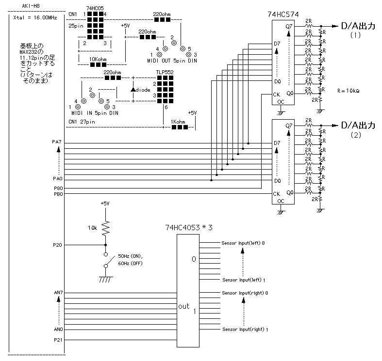 It is well known that EMG sensor is a good instrument, but there is a weakpoint compared with other "mechanical" instruments. EMG sensor does not have the "physical reaction of performance" like guitar, piano, etc. To resolve this, one musician generates very big sound as the body-sonic feedback of the performance. I have just started researching the combination of EMG sensor and bio-feedback system with the same electrode using time-sharing technique. Figure 27 shows the block diagram for the combination. Card-size controller "AKI-H8" contains 32bits-CPU, A/D, D/A, SIO, RAM, FlashEEPROM and many ports. Electrode channels (max:8ch) are multiplexed for A/D and D/A. "High impedance of separation, high input voltage" analog switch is controlled by the CPU ports synchronizing with the system.![]()